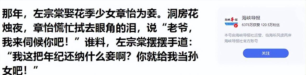 参考资料: 那年,左宗棠娶花季少女章怡为妾。洞房花烛夜,章怡慌忙拭去眼角的泪,说“老爷,我来伺候你吧!”谁料,左宗棠摆摆手道:“我这把年纪还纳什么妾啊?你就给我当孙女吧!”——海峡导报