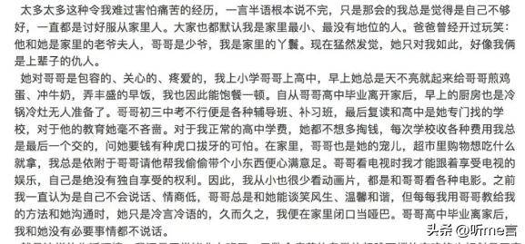 从这个女孩所发的文字就可以得知,她在家里压根就不是女儿的位置,只是丫鬟的位置。