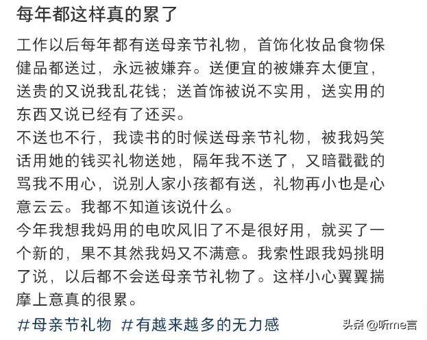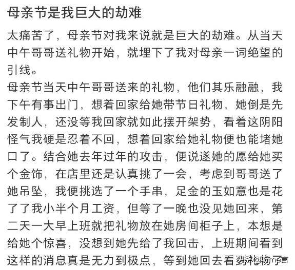 现在打开多个社交账号的帖子就会发现,很多家庭的女儿是并不期待母亲节这一天到来的。在她们看来,母亲节对自己来说就是一个劫难。