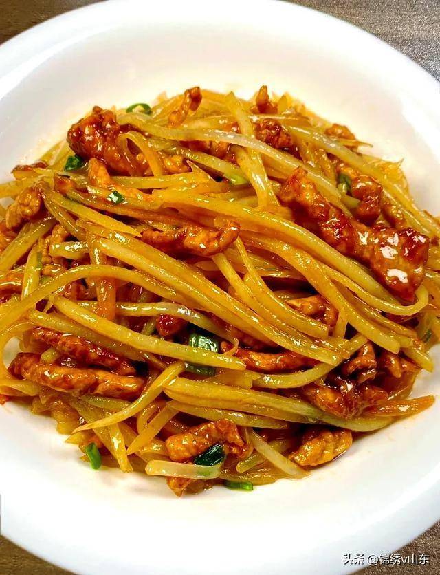 2、将土豆去皮切丝,再加热锅中倒入油,待油热后,放入肉丝翻炒。翻炒至上色后,盛出备用。