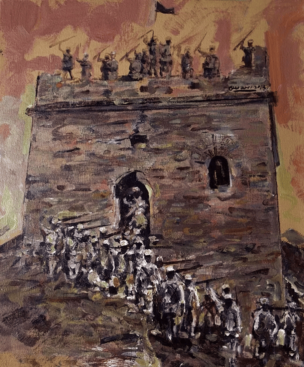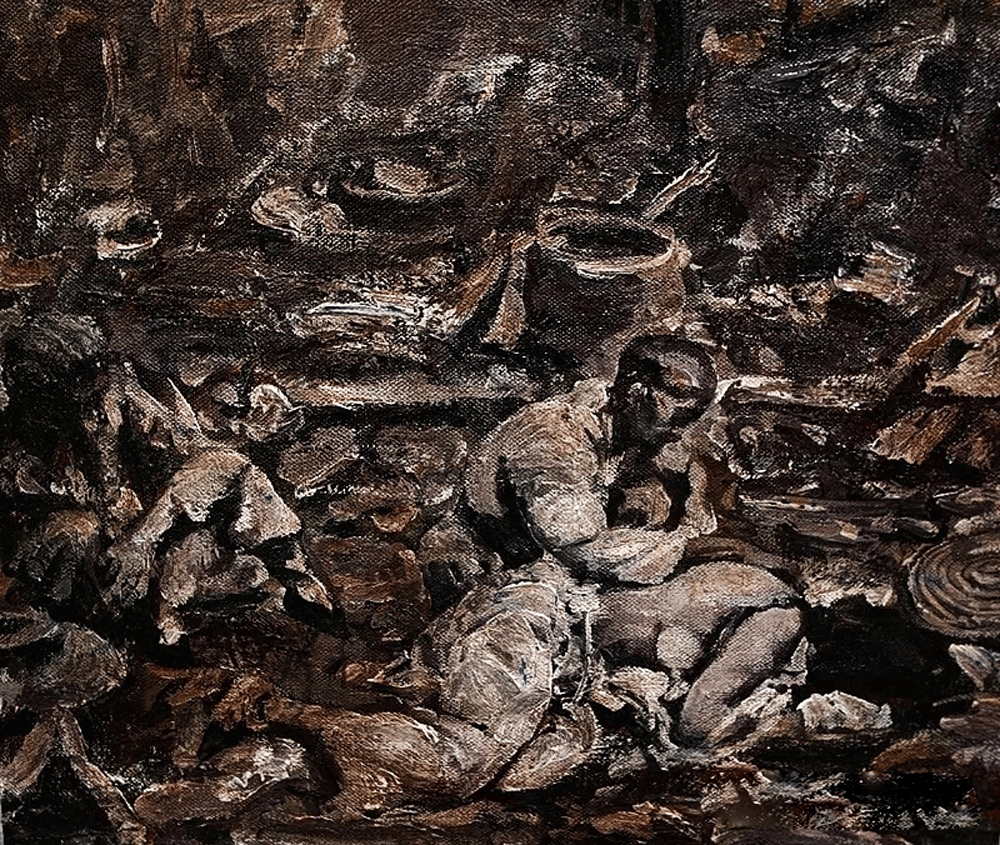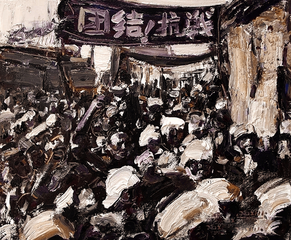 他在为“心系汶川——全国美术作品特展”准备作品时,创作了这张视角独特的画。画面突出了小姑娘表情复杂的面容,突如其来的地震灾难,使她还没有完全从惊恐的阴影里走出来,眼前的废墟以及废墟中奋力救援的战士,让她在绝境中看到了希望。那双干涩的眼睛已经没有泪水,她忧郁的的神情是对失却家园和亲人的悲痛,还是对英勇救援的子弟兵叔叔的感激?前景的写实人物与背景打破时空的救援场景的组合,使画面层次分明,对比强烈。沉厚、凝重的色调笼罩着画面,有一种悲壮的气氛。画面右下角刻意画了一只电子表,液晶屏上清晰地定格着灾难发生的时间。关注灾难中人的状态,从人性的角度,从受灾群众的视角来反映我军官兵在和平年代的突发事件中所显示的牺牲奉献精神,这样的表现方式显然更具亲和力,更具人性化,更有感召力。