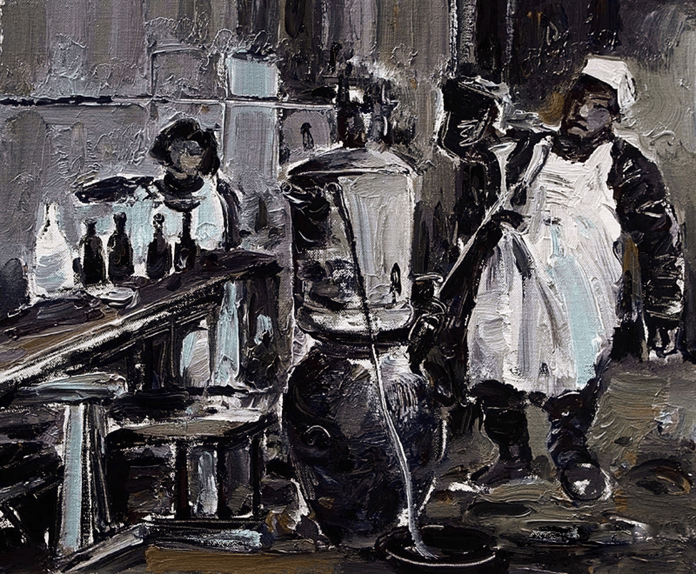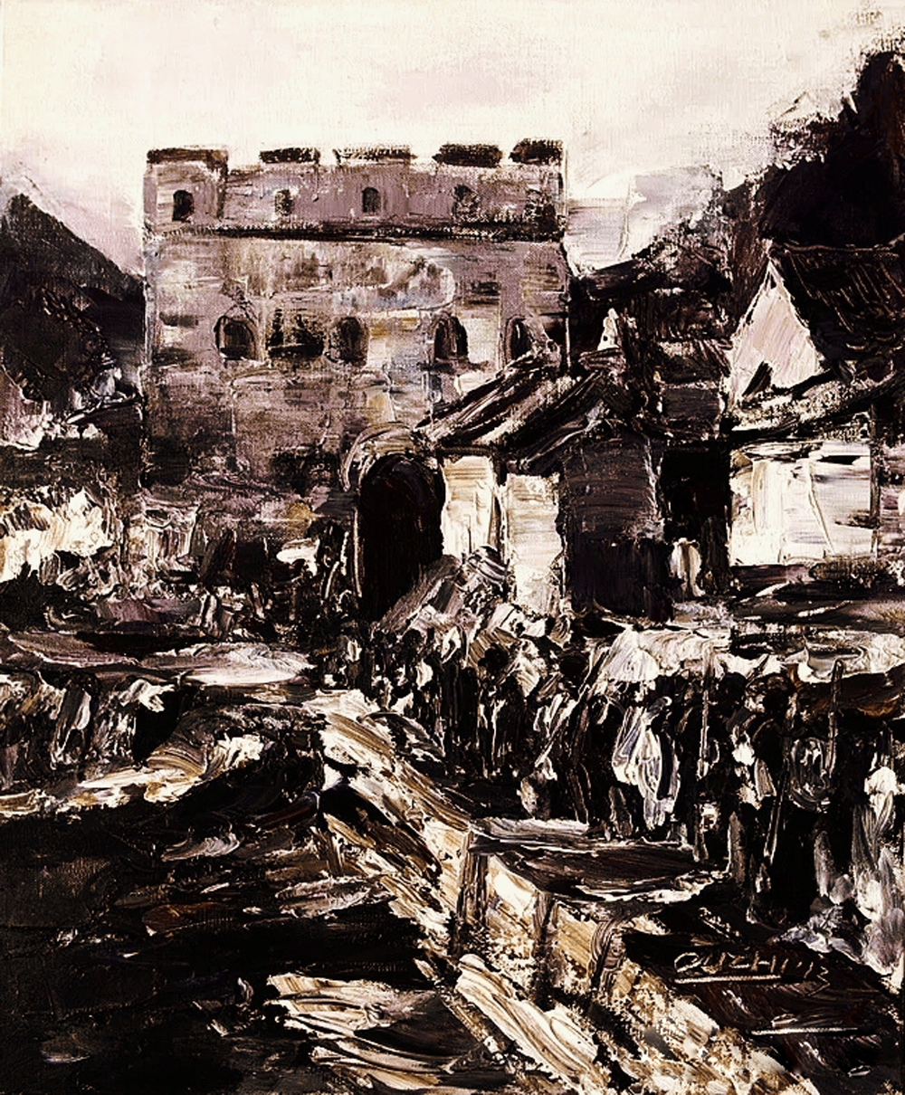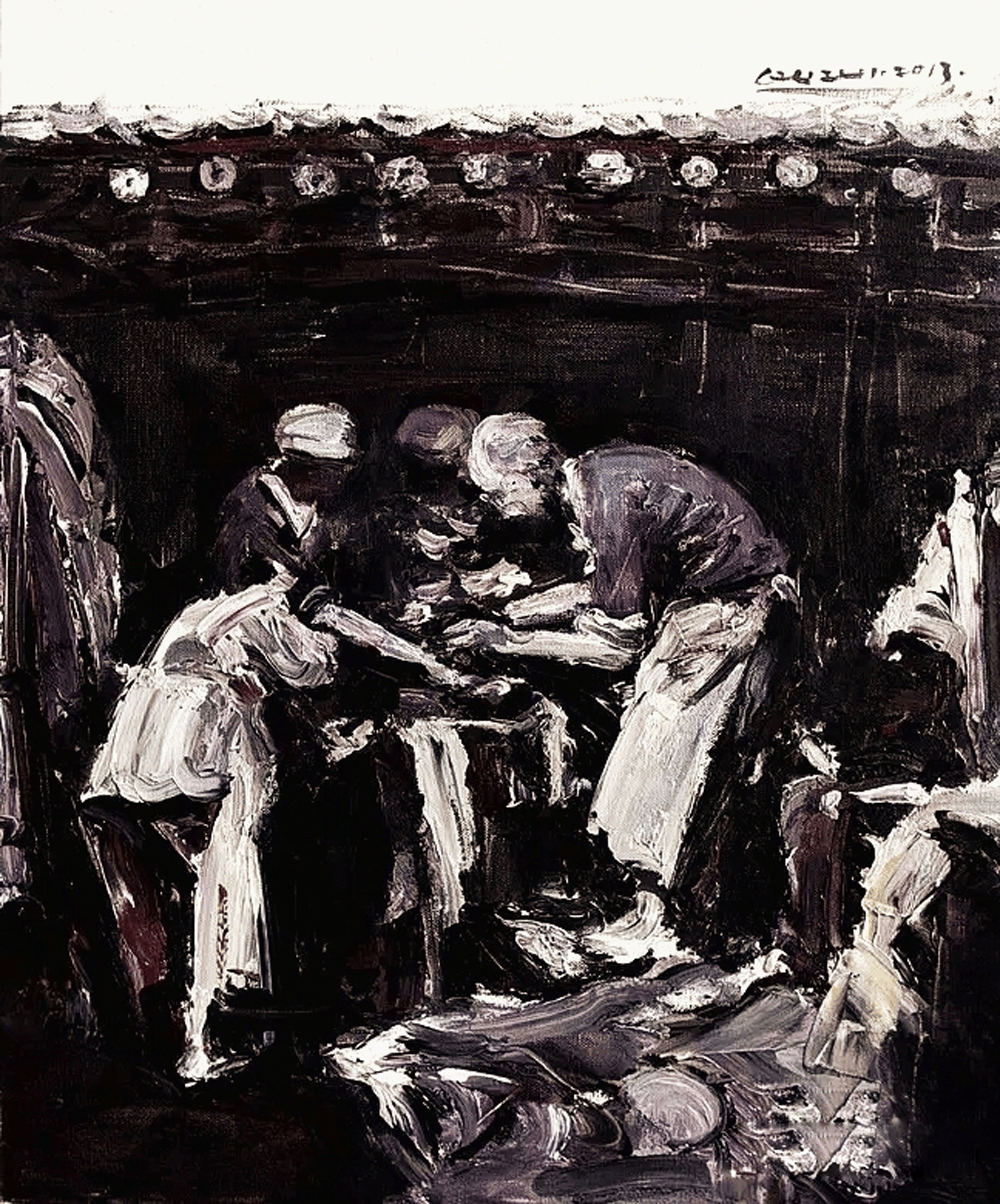 鲁人的个性,军人的气质,在曲直的身上和画里被统一在一起。著名文艺理论家陆文虎先生曾在《关于军旅文学》一文中就“军旅文学”的概念提出:“其内涵是军旅写和写军旅,或者换句话说,是军人写军人,是非军人写军人和军人写非军人”。这个概念的新颖之处在于将“军人写非军人”纳入了“军旅文学”。我个人是非常赞同这个观点,我愿意借用这一概念,将“军人画非军人”也纳入“军旅绘画”的视野,使军旅绘画从内容到样式都变得更加丰富。那么,曲直的《渔人码头》系列等作品,显然也就成了“军旅绘画”的一部分,而曲直在油画领域的多方探索和尝试,显然就既符合其军人的身份,又可以在学术层面走得更远和更开阔。
