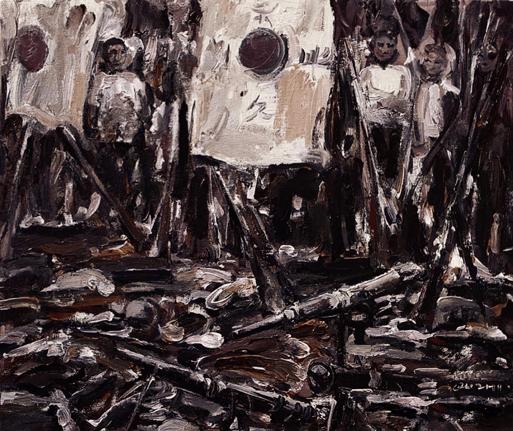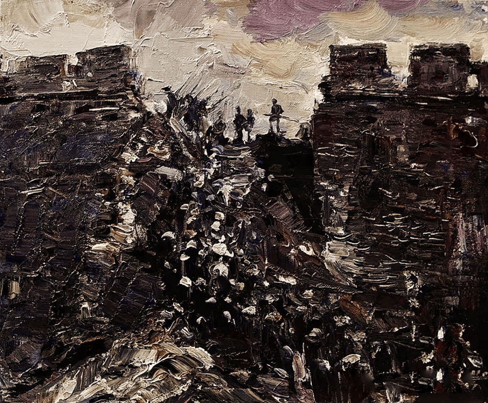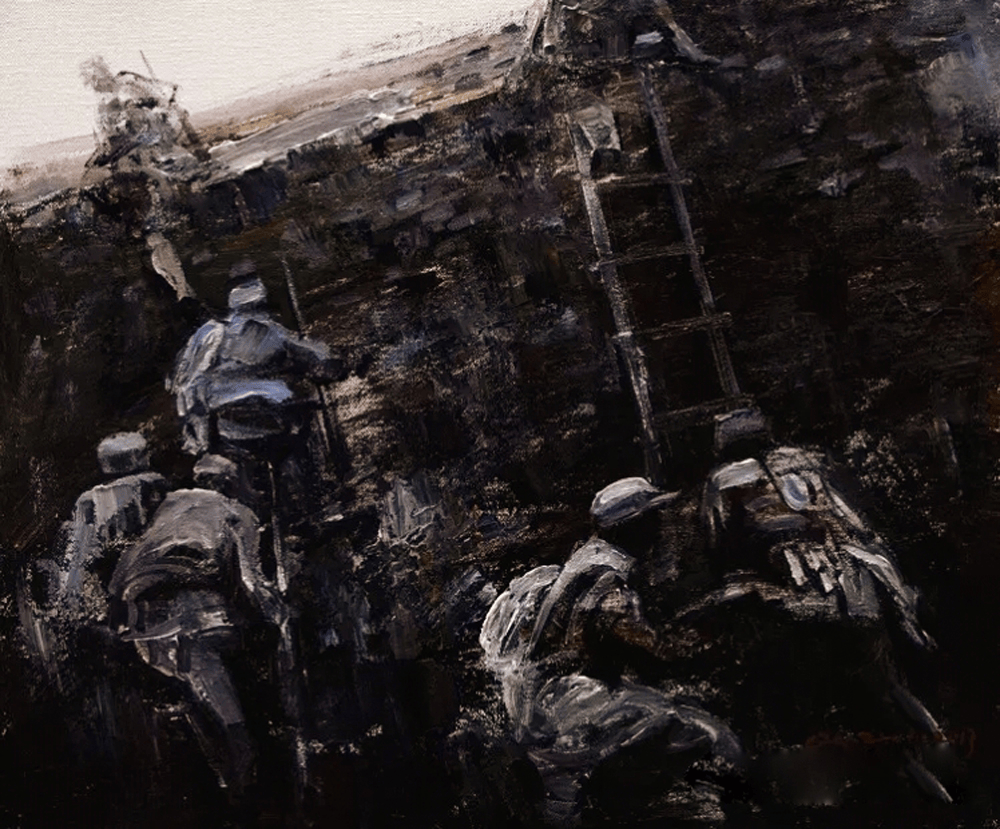 油画《0度》和《拯救》是曲直贴近现实,以正面形象来表现我军训练与抢险为内容的鸿篇巨制。《0度》塑造了一名全副武装的士兵手持先进的现代化武器正在冲锋的情景,用具体而醒目的形象体现了“不变质、谋打赢”的新世纪新阶段的我军历史使命。士兵的职责就是练为战,取名“0度”,突出的就是这种随时出击的临界状态。为了在画面中体现铁血精神和阳刚之气,作者采用了400×400cm的巨幅画面,并有意将人物形象拉宽,在体量上显得更沉稳,更具扩张力。这幅作品具有具象表现绘画的典型特征,以士兵硕大的个体形象为载体,通过深入得塑造和刻画来抒发对士兵的情感,挖掘士兵内在的情怀。在表现手法上,作者努力追求一种强悍的风格,强调了“未完成”状态,由“抹去-重画-再抹去-再重画”的过程,呈现出“痕迹错叠”的画面,体现出作者契而不舍的生命意志。流畅阔大的笔触,充满力量和激越的情绪,迅疾与生涩、厚重与薄润,块面与线条、扭曲与方正的对比,产生了或矛盾或互补的视觉节奏感。整体写实的主题表述与局部独立的形式魅力,通过强烈的视觉冲击达到精神的震撼。