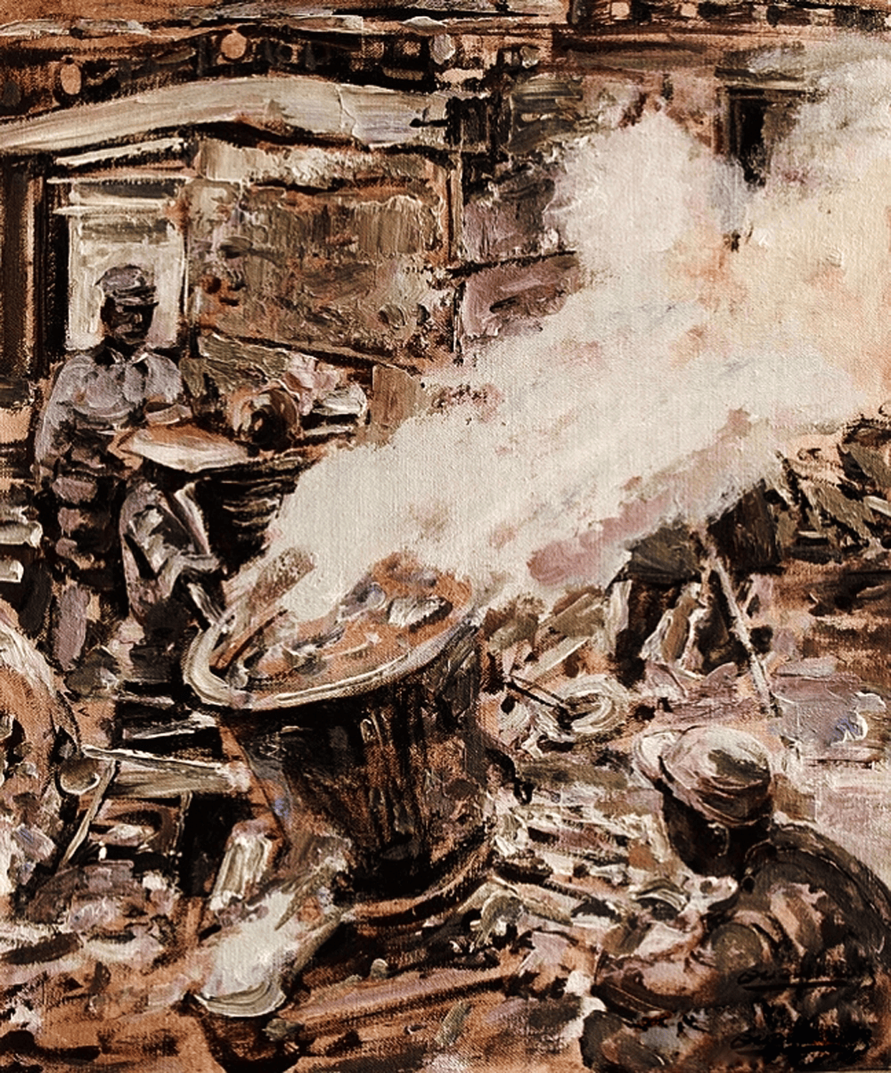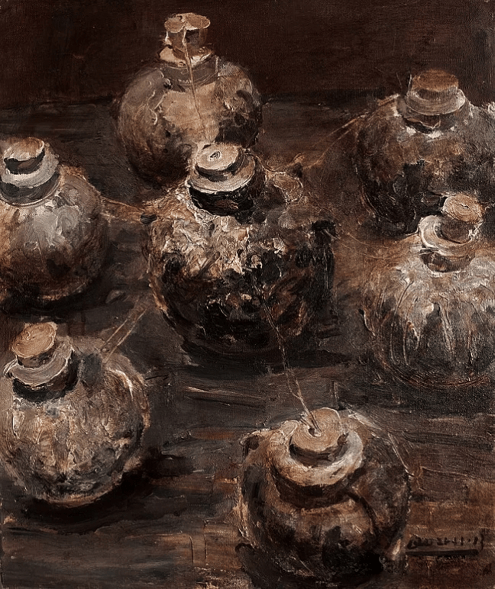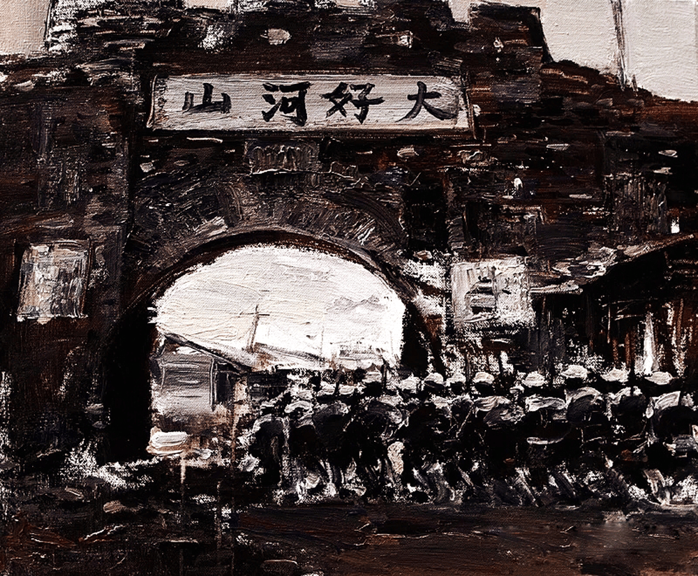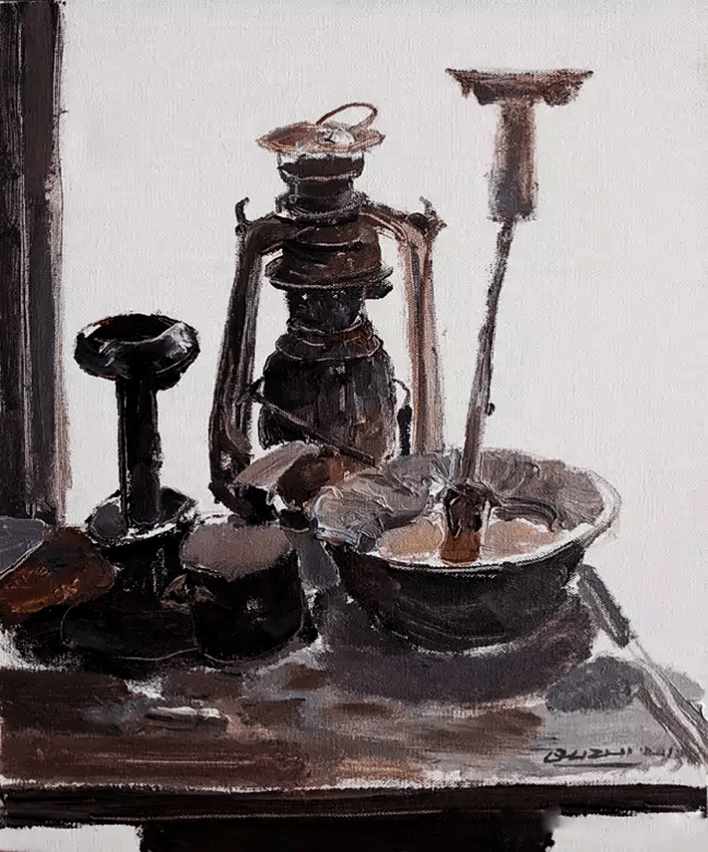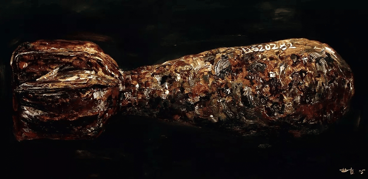 油画《盾》可以说是曲直在静物题材的开掘上更具想象力的一件作品。这幅以1998年抗洪抢险为主题的创作,截取了江堤的一段来重点刻画,画面前景主体,是一盏悬挂在绳索上的照明马灯,底部是浑浊而汹涌的江水,背景是一堵拦截洪水的沙袋墙。这些特定物象的组合,显然是提炼加工后的结果,虽然每个具体物件是真实写实的,但勿庸置疑,这是个想象的画面。中心的马灯既有实际的照明功用,又是画面的光源,且有一定的象征意义;背景沙包上叠印的文字与沙袋墙融为一体,但细心品读后会发现,那些文字是有关全国人民关注、支援抗洪一线的新闻报道的标题,显然是一种超现实的表述方式。面对平凡、熟识的景物,通过对真实的深入表现和追寻,往往能使景物体现出更独特的美感,显然《盾》属于这样的作品,它将宏大的主题化解为简单、具体、普通的景物,并通过对景物深入的塑造和刻画,呼应、诠释出主题的高度,达到了“此处无声胜有声”的妙境。