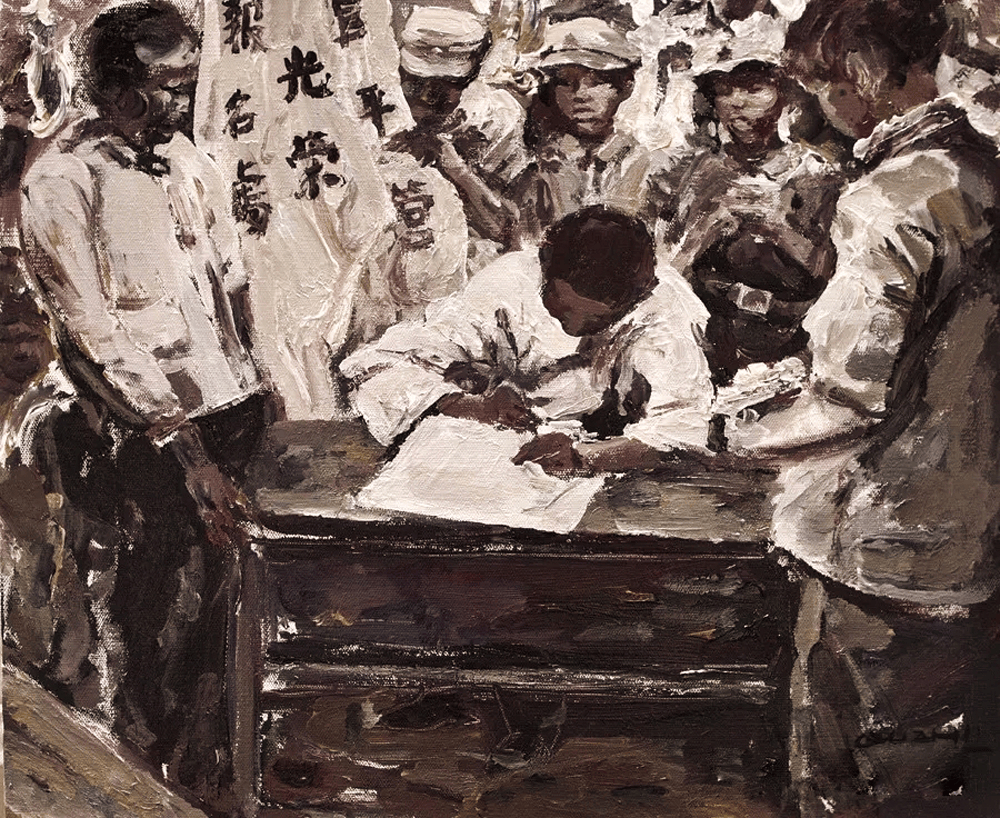 在这幅作品中,作为改革开放总设计师的领导人,其高瞻远瞩的胸怀和紧定果敢的意志,通过形象和手势,不动声色地传达出来。画面明快的节奏和昂扬的气息,烘托出主题的宏大和深邃。《聂帅》反映的是聂帅在晋察冀边区领导抗战时的战斗生活。为着意营造一种历史感,曲直在处理画面时以冷灰色调为主,在色相上有意仿效老照片的效果。聂帅戎装马上的形象英姿勃发,人物和马的塑造,整体简括,有雕塑感。背景空旷简约,马与人物的投影模糊虚幻,有一种写意的韵律。这幅作品在艺术处理上,多少借鉴了德国画家李希特的图像制作方式——具有柔光和晕眩效果的仿真照相方式。将革命历史题材与某种流行表述方式结合起来,这种选择也表现了曲直对当代美术的敏感和吸纳,以及竭力在军事题材中注入新观念和手法的开放心态。对待革命历史题材人物创作,怎样展现主人公的神采,同时通过他们的艺术形象传达出深邃的历史和社会背景,是历史画必须面对的问题。军旅画家在这个领域具备大有作为的空间,他们对革命历史的认同和熟悉,保有素材的途径和创作实践的积累等方面有不可替代的优势。曲直的尝试只是一个开始,随着不同先进绘画理念和技巧的引入,历史画创作的多元化格局必将到来。