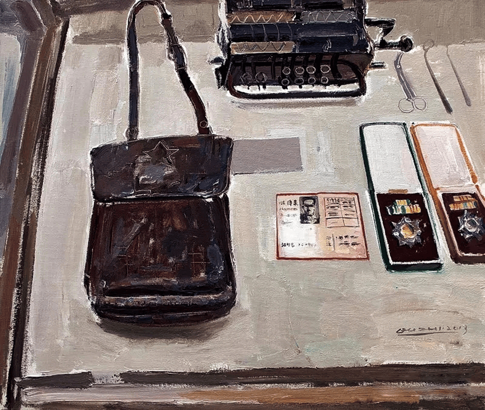 艺术手法上重视材料的视觉感受,如颜色的堆砌,以刀代笔的画法,中心光束的运用等,有一种强烈而深沉的英雄主义情怀。作品以简洁明了的图像穿越了历史的时空,是一件主题性和艺术性结合得非常完备的作品。而《时空对话》在某种程度上可以说是对《岁月难封》一二的综合,同时融入了显著的观念色彩。画面中心将不同年代的军装和锣鼓箱融合对接为一体,左右两边器具、装备的并置,将过去和现代用一种直观的图像方式连接起来,而这种跨越时空的对接,从表面视像的对接引发了精神的承传和对接,使作品深刻度与丰富性大大增加。这样的静物作品,它所负载的信息含量和精神含量,甚至超出了同类题材的人物画,通过“物”使“人”显得更加崇高。这种无“人”的美,为军事主题的表述提供了一个新颖的样式,同时在意境的传达上显得更加含蓄,更有感染力。