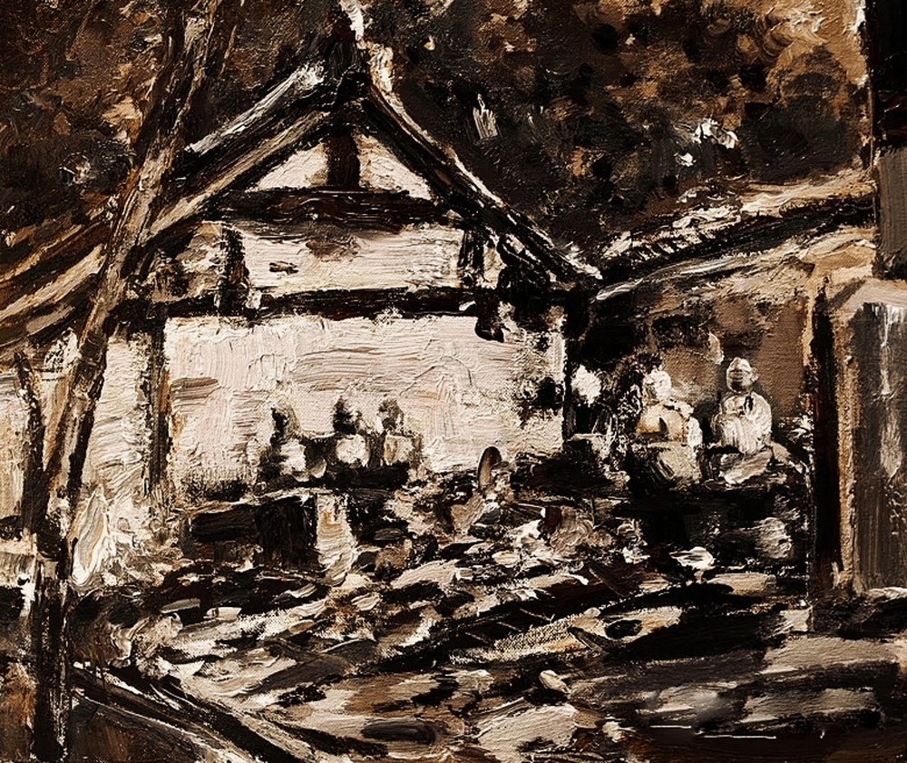 《渔人码头》系列是平淡而多情的。我们可以看到曲直以朴素的图像记录有关家乡、家乡普通人的印象,那些平凡、朴素的感情点滴自然地在他心头涌动,他没有去猎奇,也不需要刻意突出地域和人物特征。他只是心平气和地描绘那些最熟悉而且难以忘怀的印象与记忆,这些作品是记忆和现实混合的产物。如《石老人》中手捧蛤蜊,咧开缺牙的嘴憨笑的老者;《闲谈一刻》中两名双手交叉胸前,头带艳色头巾、窃窃私语的渔女,他们似乎是从画布里自然生发的,并用形象的魅力印证了画家那些深埋在内心的乡情。平淡是这组系列作品的基本情调。无论是构图、素描与色彩关系,人物的神情动态,曲直都是在有意识地减少、排除强烈的戏剧性表现,取景近似摄影机的镜头,主体人物突出,背景偏窄偏简,人物有时故意“剪裁”成不完整状态,有一种纪实的意味。造型上取其稚拙的特征,渔市上的摆摊人,鱼船边的修网人,码头上野炊的赶海人等,他们质朴而略显笨拙的体态和“童贞”般的表情,均给人以温暖祥和的印象。更难能可贵的是,这种印象的获得是从作品蕴涵的平淡情绪中产生的。当然,这种“平淡”既是画家的气质、经历,又是画家精心编织的艺术幻景,是画家内心情感与文化倾向结合后的理性追求。以码头渔人这样的特殊场所和群体为寻常生活景观,来体现人生的哲理主题,使这组作品充满了人文精神的关怀。