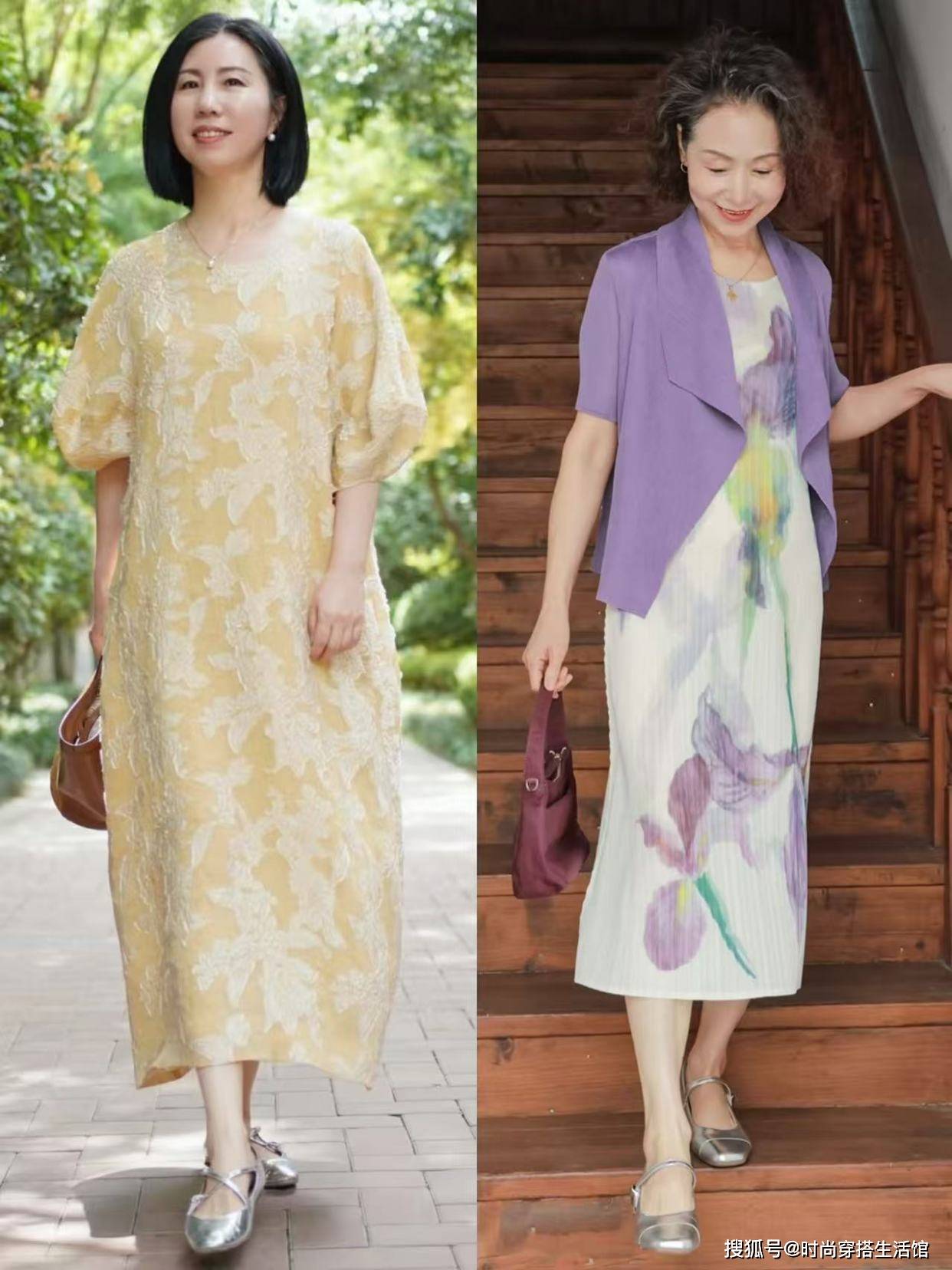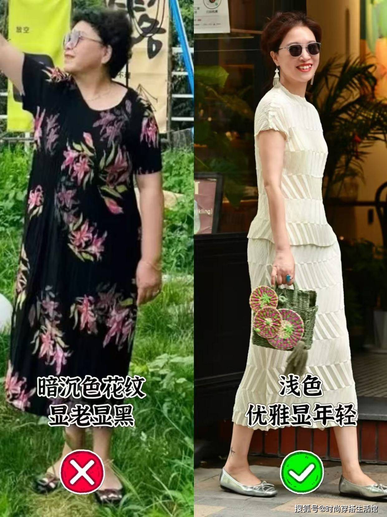 其次就是中老年女人随着年龄的增长,非常喜欢穿花裙子,尤其是各种大面积印花、密密麻麻的碎花元素的裙子,整体饱和度太高会显得完全没有美感,从而让人的视觉效果看起来眼花缭乱,整体穿搭会显得土里土气。反之我们选择基础款或者纯色的裙子会比碎花裙大方得体很多。