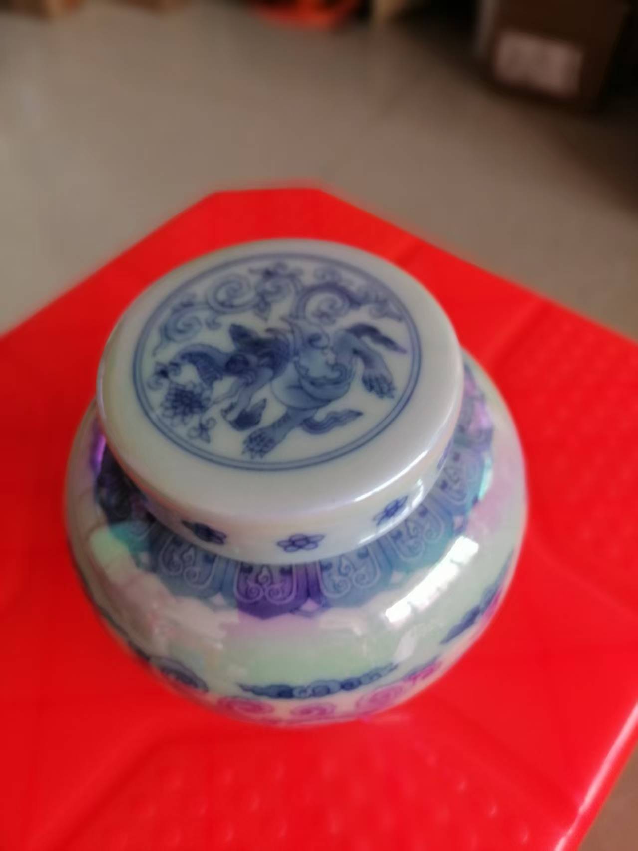 罐身以青花绘制兽纹,常见海兽、麒麟、夔龙等,辅以海水江崖、朵云、蕉叶等纹饰 。青花发色或淡雅清新,或浓艳明快,依不同时期、不同配方呈现多样效果。成化时期,青花采用平等青料,发色柔和淡雅,与洁白胎釉相得益彰 。纹饰绘制精细,海兽形体多由象头、狮身组成,四肢健硕,神态凶猛,或腾跃于海浪间,或穿梭于云气中,生动展现明代工匠高超绘画技法,将青花艺术与祥瑞寓意融合,让瓷器不仅是实用器,更是艺术与文化的载体 。