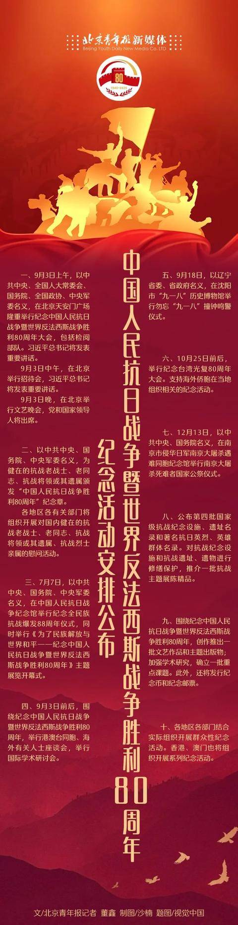 九是,围绕纪念中国人民抗日战争暨世界反法西斯战争胜利80周年,创作推出一批文艺作品和主题出版物;加强学术研究,确立一批重点课题。此外,还将发行纪念币和纪念邮票。