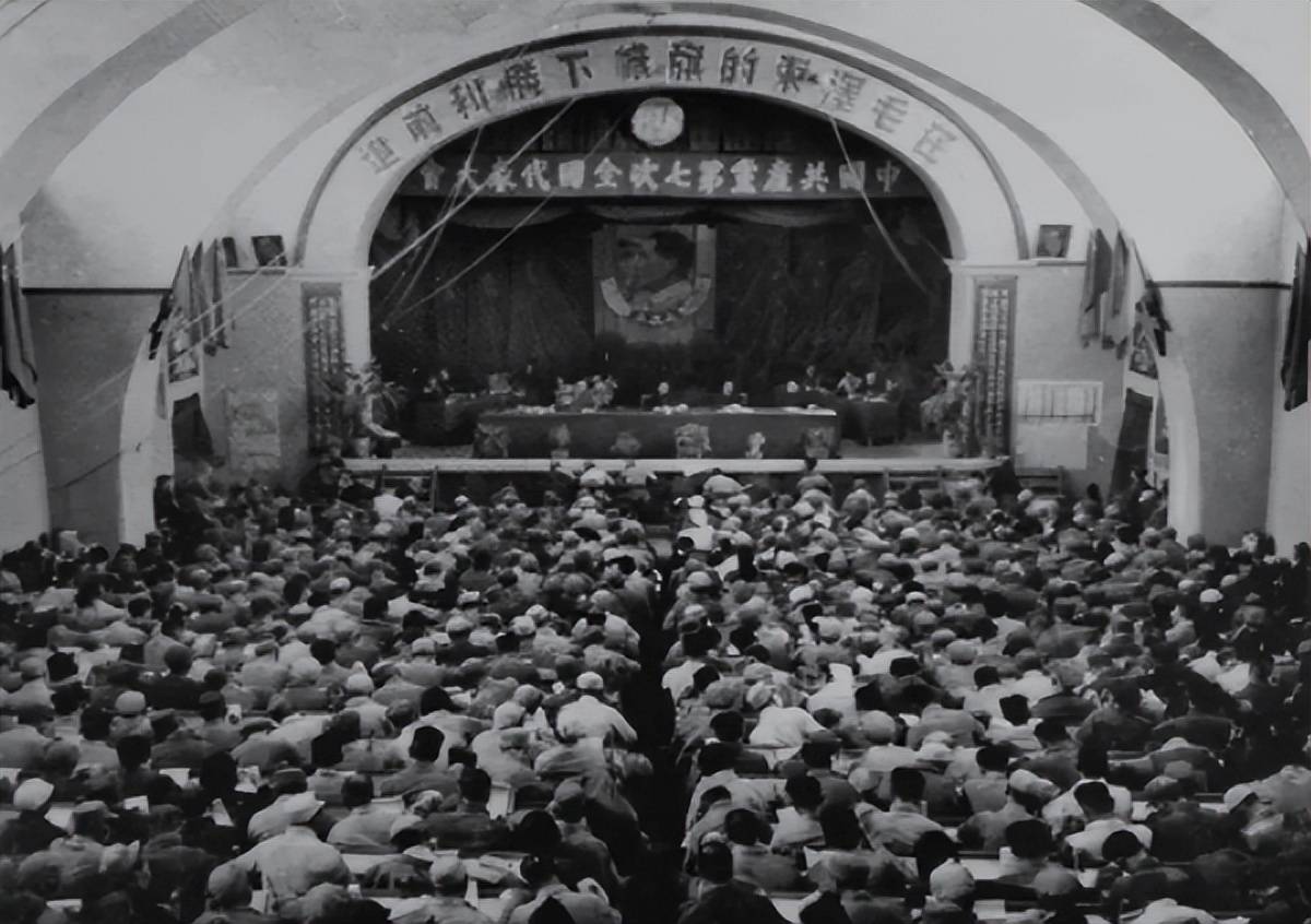 1945年4月23日至6月11日,中国共产党第七次全国代表大会在延安杨家岭的中央大礼堂隆重召开。出席会议的代表共有755人,他们肩负着代表全党121万党员的使命,为迎接抗日战争的最终胜利而齐心协力。大会的开幕式由任弼时主持,毛主席在开幕式和闭幕式上分别发表了重要讲话。此次大会通过民主选举的方式产生了以毛主席为首的中央领导集体,标志着党组织在这个特殊历史时期的高度团结。