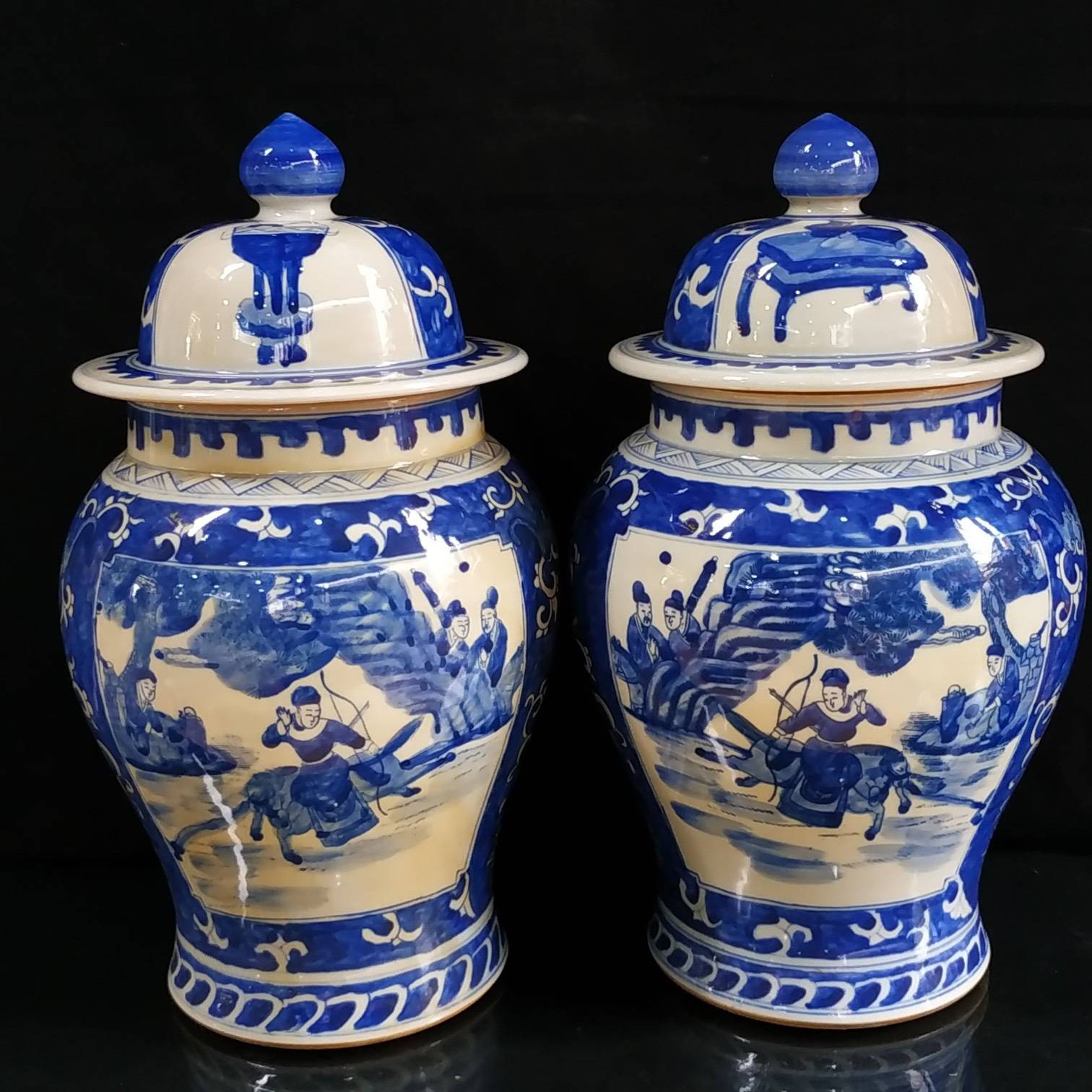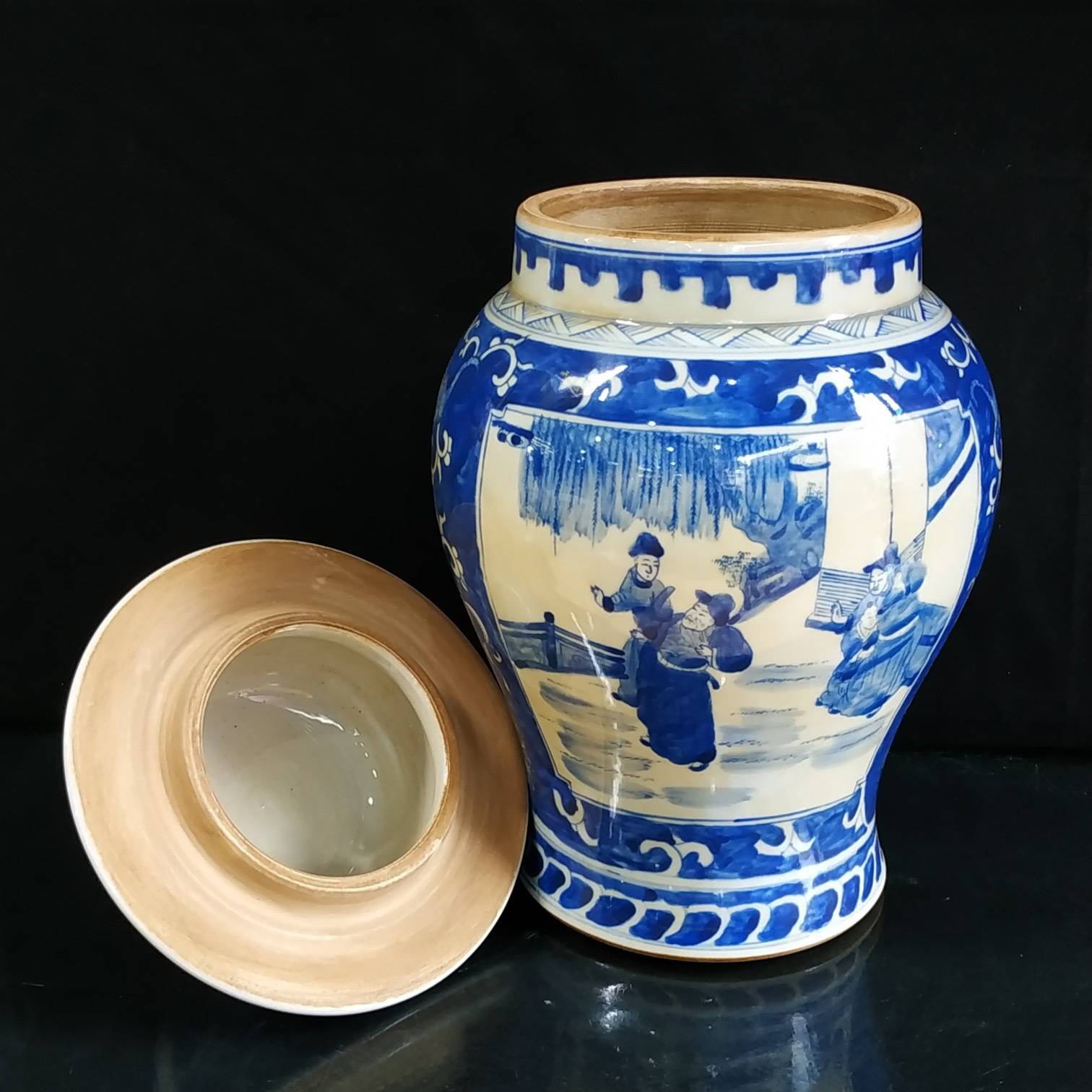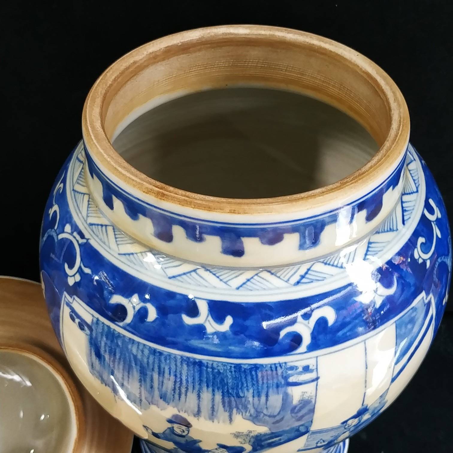 罐身上的「人物故事」最是藏着高情商的巧思。康熙朝的画师们深谙「借古喻今」的智慧,把《三国演义》《西厢记》的故事画在瓷上,看似说古人,实则道人心。就说那幅「萧何月下追韩信」,画师没画千军万马,只取了月下追舟的瞬间:萧何的官靴沾满泥点,袍角被夜风吹得乱舞,却死死盯着前方的小船,那份急切让三百年后的我们都替他捏把汗;而船头的韩信,回首时眼神复杂,青花勾勒的眉尖似蹙非蹙,像极了现代人面对机遇时的犹豫与期盼。