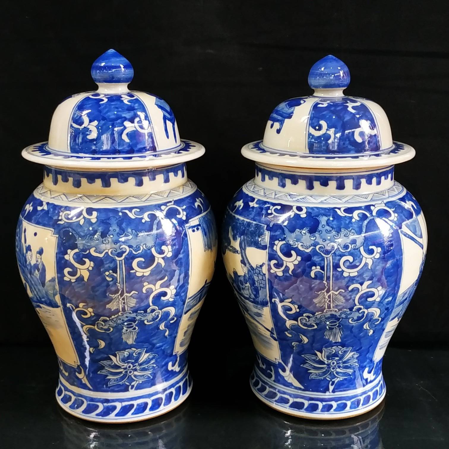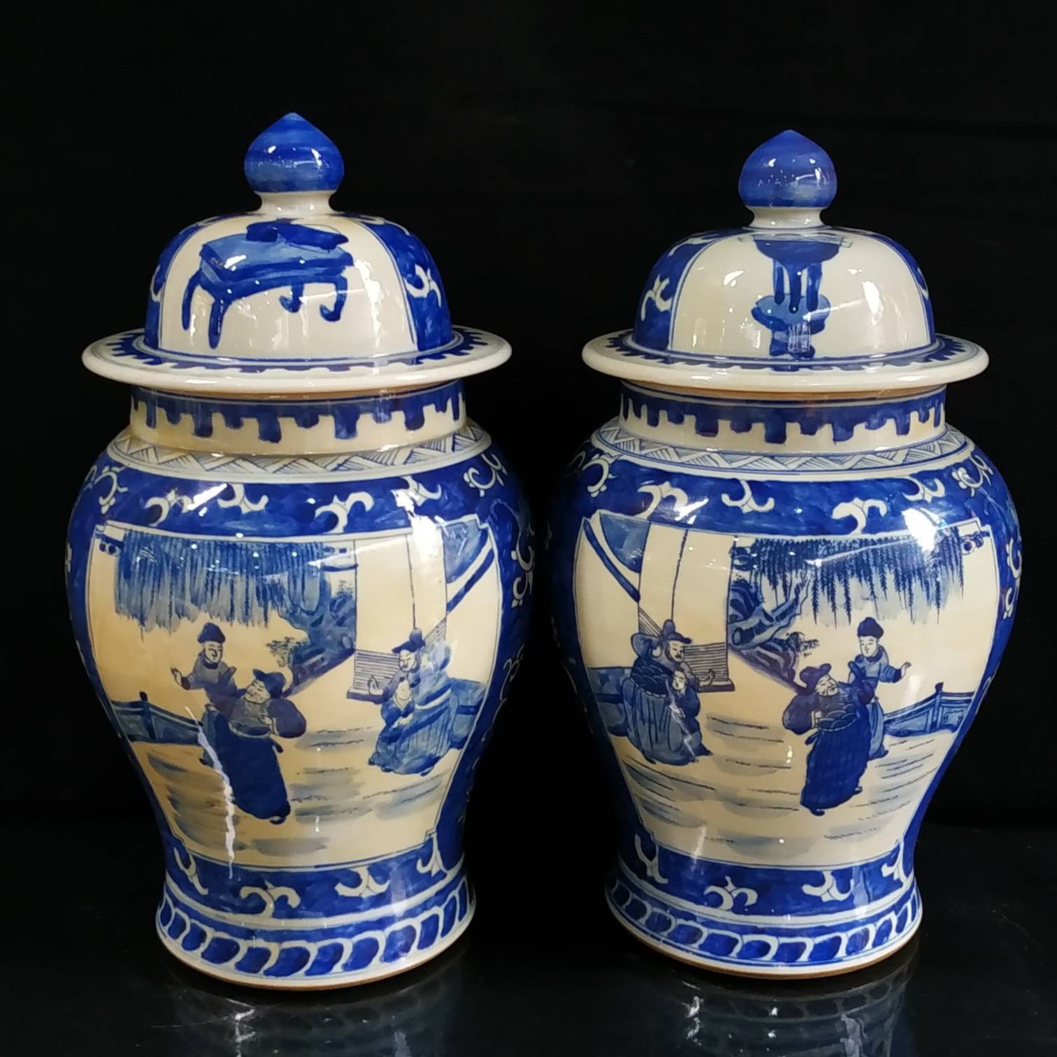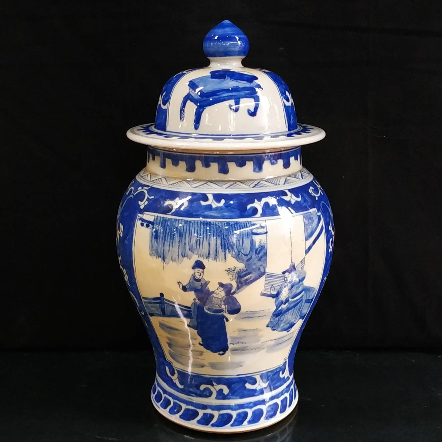 罐身上的「人物故事」最是藏着高情商的巧思。康熙朝的画师们深谙「借古喻今」的智慧,把《三国演义》《西厢记》的故事画在瓷上,看似说古人,实则道人心。就说那幅「萧何月下追韩信」,画师没画千军万马,只取了月下追舟的瞬间:萧何的官靴沾满泥点,袍角被夜风吹得乱舞,却死死盯着前方的小船,那份急切让三百年后的我们都替他捏把汗;而船头的韩信,回首时眼神复杂,青花勾勒的眉尖似蹙非蹙,像极了现代人面对机遇时的犹豫与期盼。