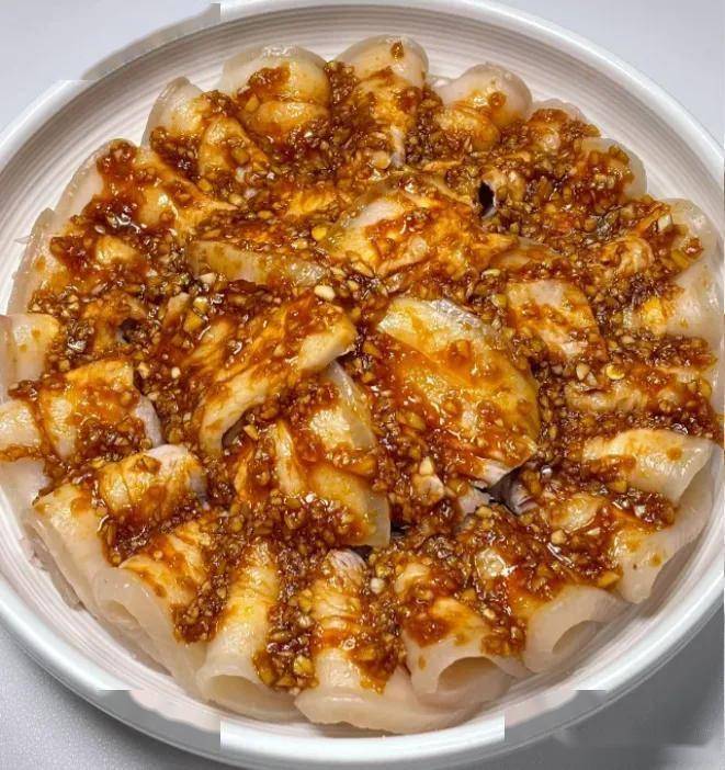 ,配上捣得细腻的蒜泥酱,蒜香扑鼻却不冲人。重点是要用冰水激一下,这样肉质会更紧实。