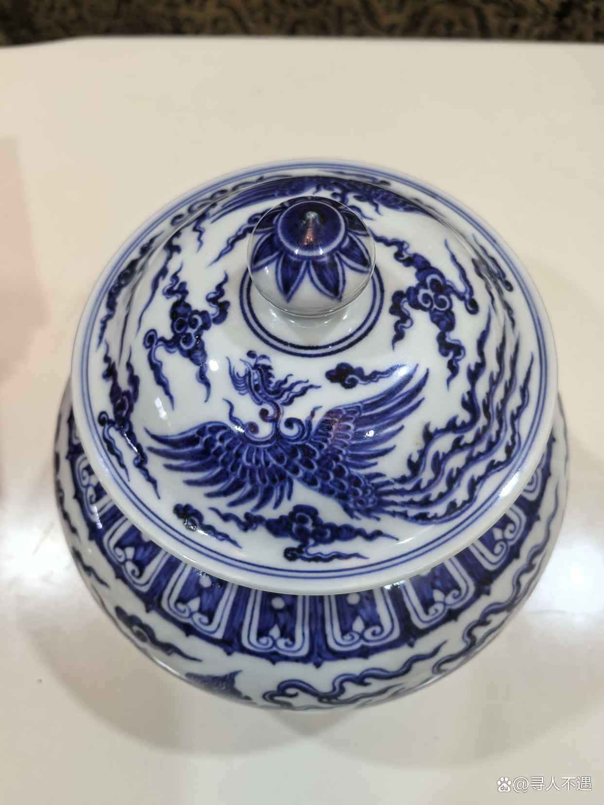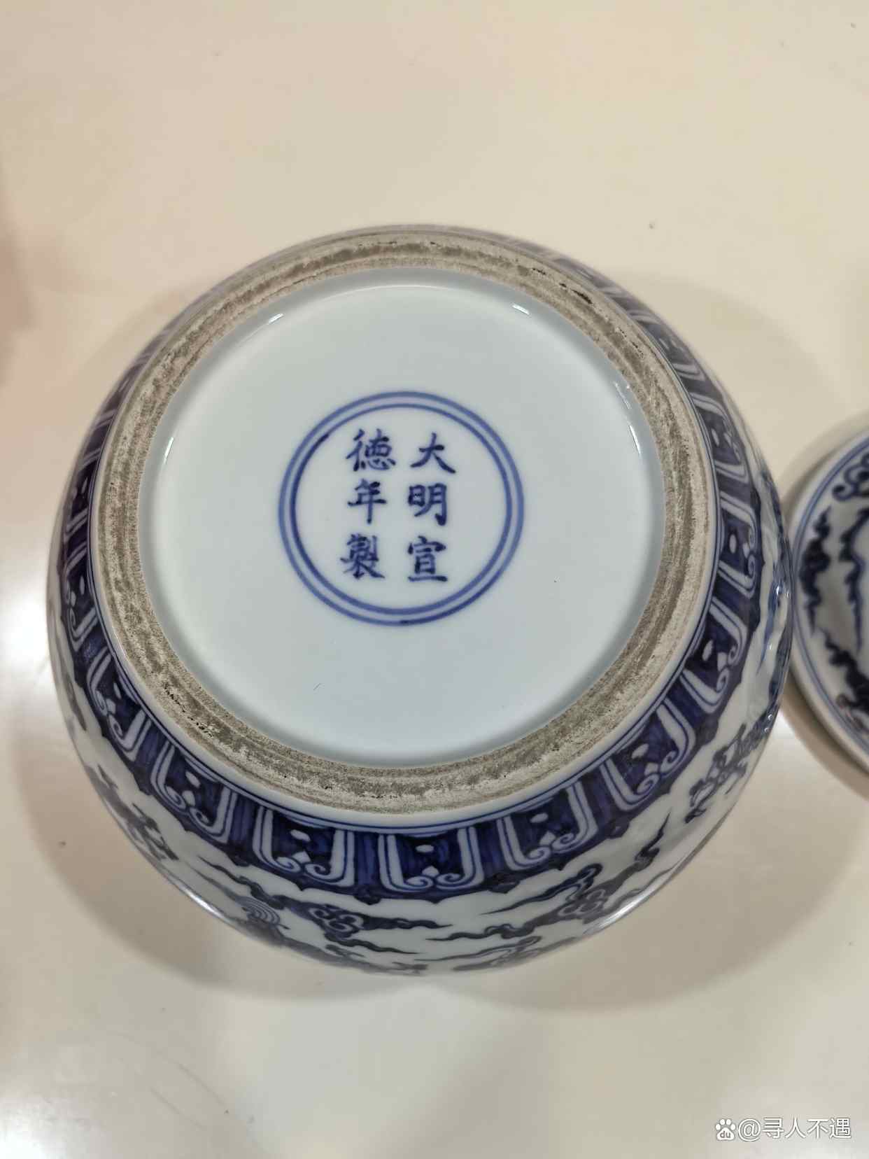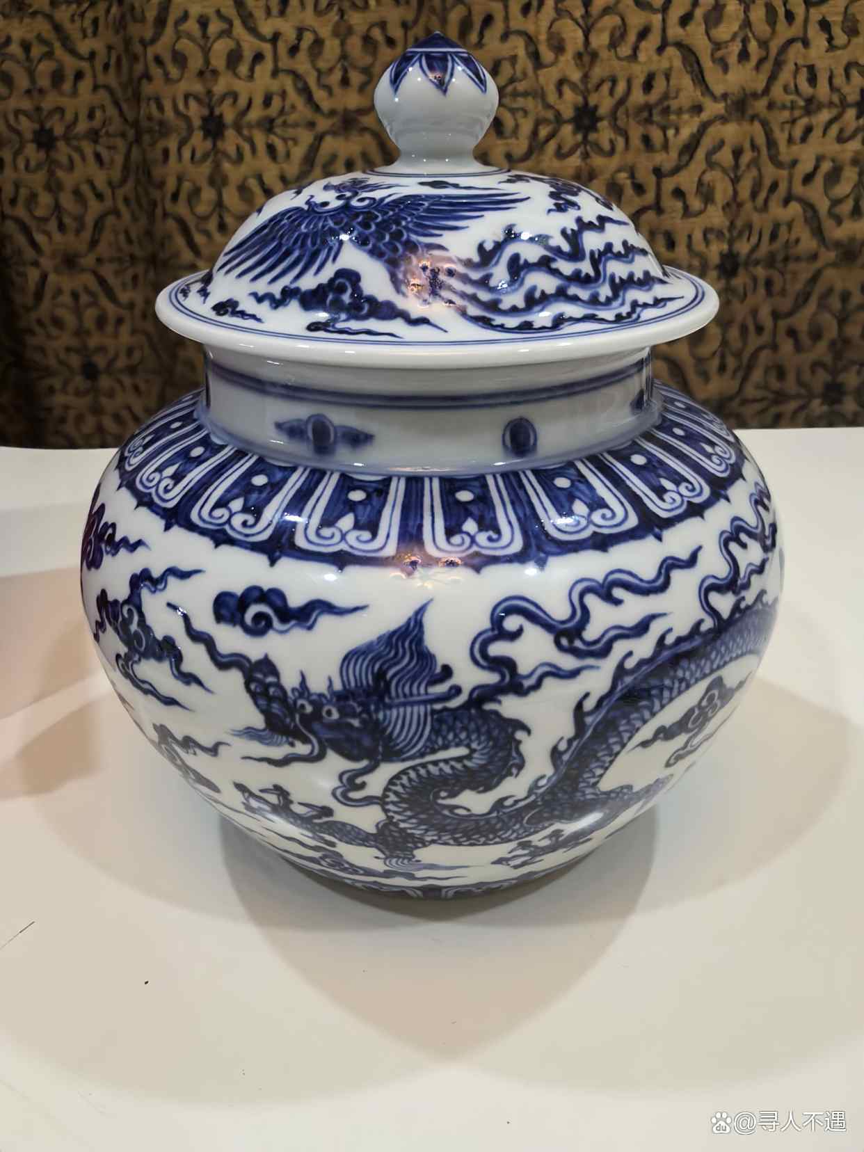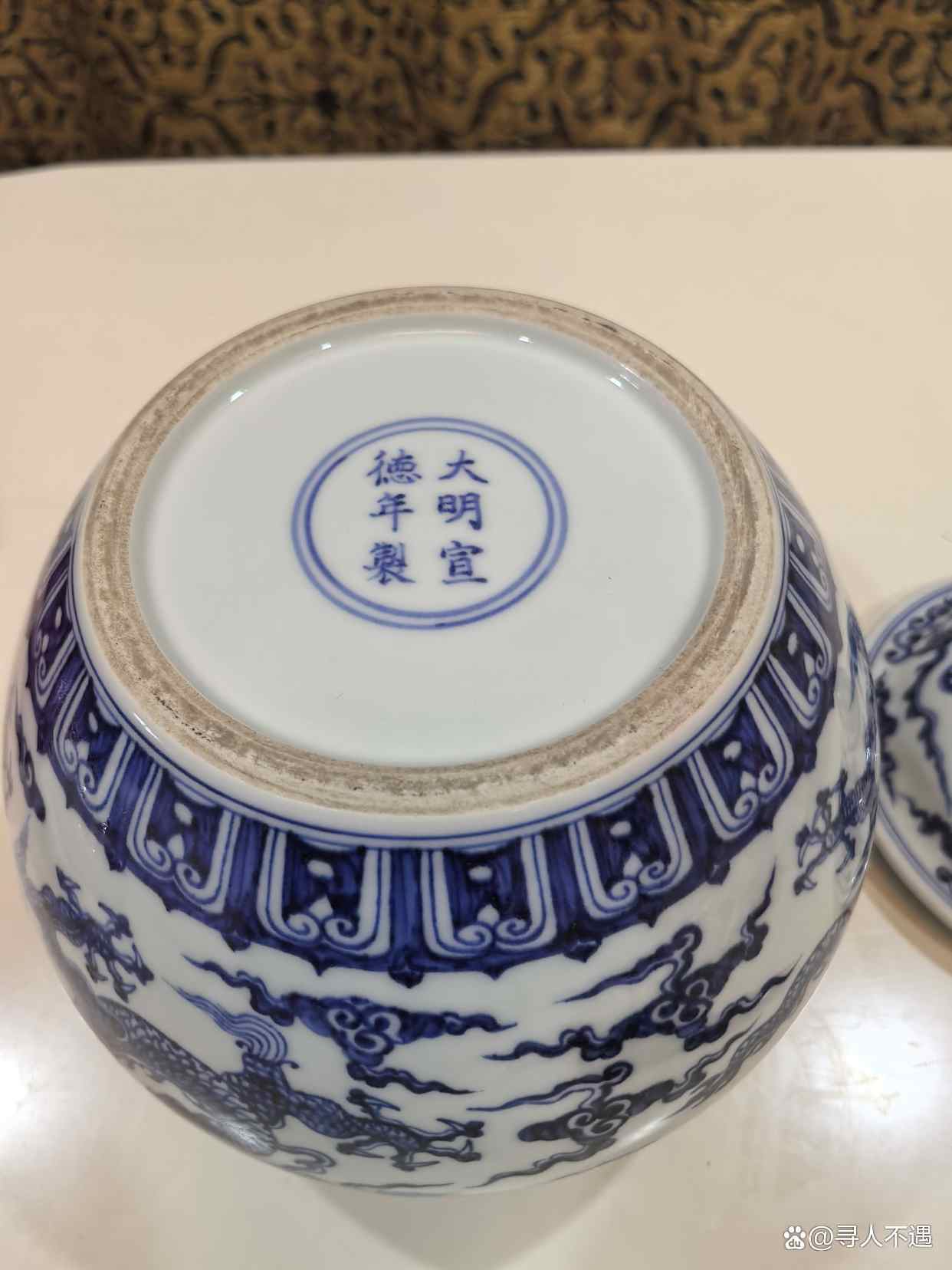 在景德镇老窑址的余温里,在故宫博物院的玻璃展柜间,在民间藏家的锦盒深处,总有一些瓷器带着时光的密码,静静等待与懂它的人对话。今日所见的这件青花龙纹盖罐,便是一件凝结着宣德风华的珍宝。它以雪色胎体为纸,钴料青花为墨,在圆润的罐身上绘就腾云巨龙,盖钮处振翅飞鸟与罐身瑞兽相映成趣,底部"大明宣德年制"六字款识如一枚时光印章,将六百年前景德镇御窑厂的烟火气与帝王心事,都封存在这不足尺余的器物之中。