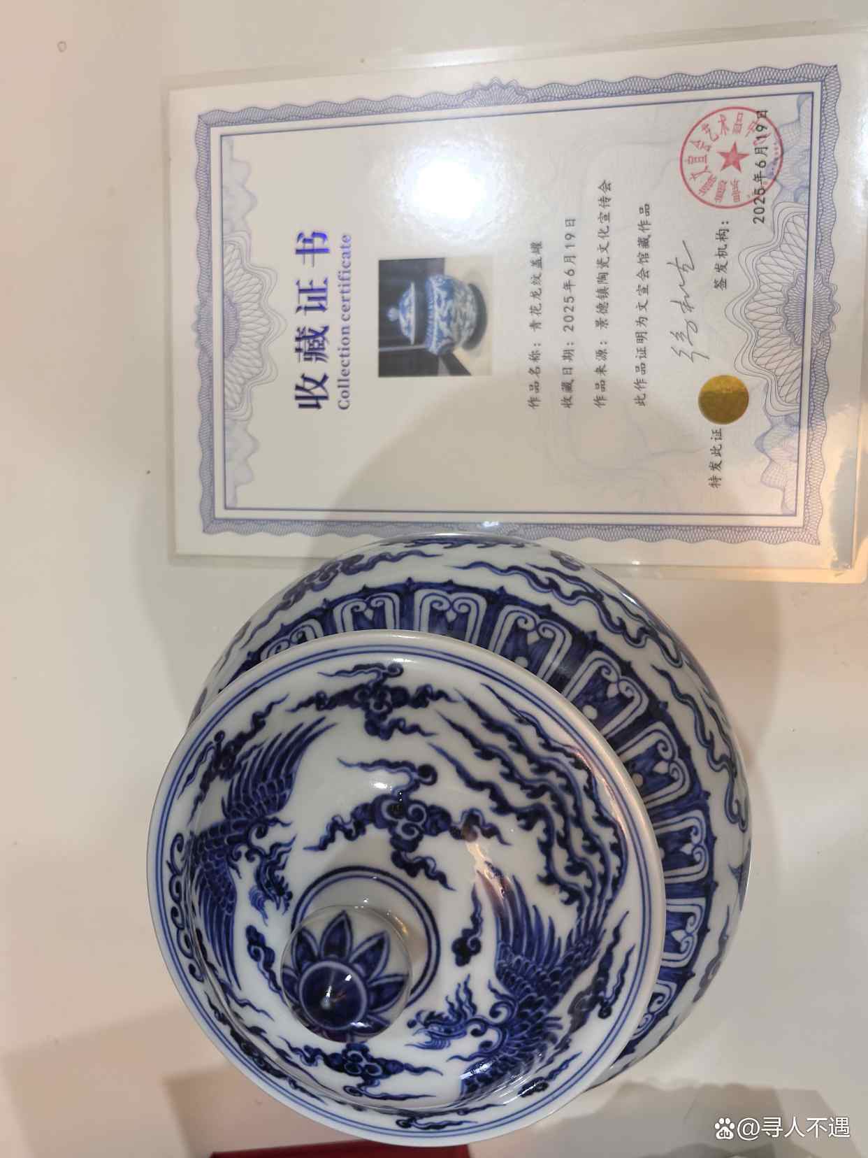 历经六百年岁月流转,此罐能完整保存至今,实属幸事。从景德镇御窑厂的窑火中诞生,到装入锦盒随贡船沿京杭大运河北上,再到清代可能流入王府、民国时期辗转至民间藏家手中,每一次流转都在其表面留下时光的印记——罐身龙纹的云气间有几处细微的釉层脱落,是清末民初战乱中搬运时的擦痕;底部边缘的浅棕色磨损,是数代藏家擦拭时的温柔摩挲;收藏证书(图5)上"2025年6月19日"的日期,则为这段历史续上了新的篇章——它如今属于"文宝会馆",在恒温恒湿的展柜中,向世人讲述着跨越时空的故事。