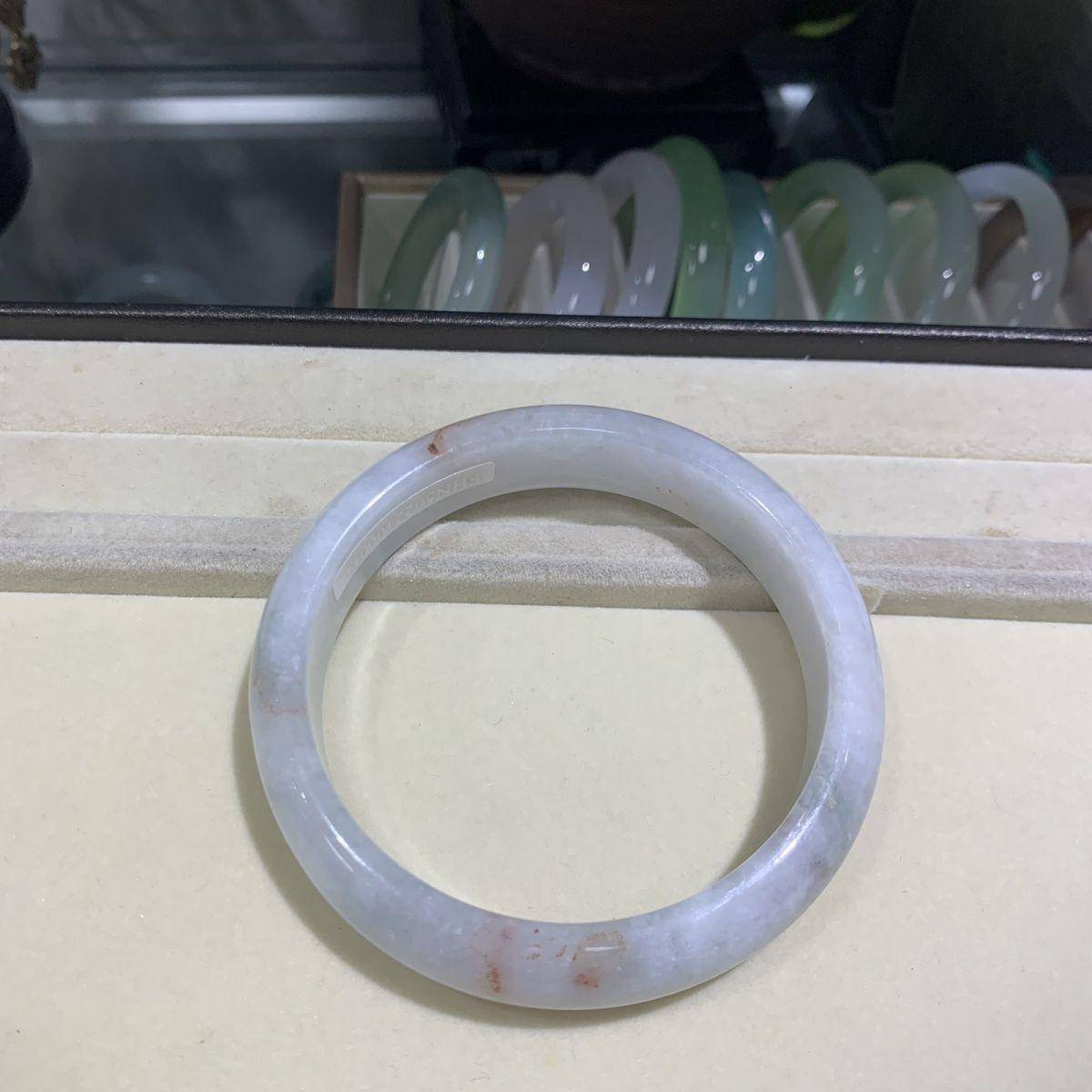 64圈口的洒红翡手镯堪称收藏级珍品,冰润底子上点缀着天然形成的红色矿物沉积,宛如雪地里绽放的梅花。A货证书确保其天然属性,8.3mm的条杆粗细恰到好处地平衡了佩戴舒适度与视觉冲击力。这类带红翡的镯子特别适合搭配素色旗袍或真丝衬衫,当举手投足间那抹红色若隐若现时,整个人都会散发出古典与现代交融的气场。更难得的是其种水已达高冰级别,在灯光下能看见清晰的荧光效应