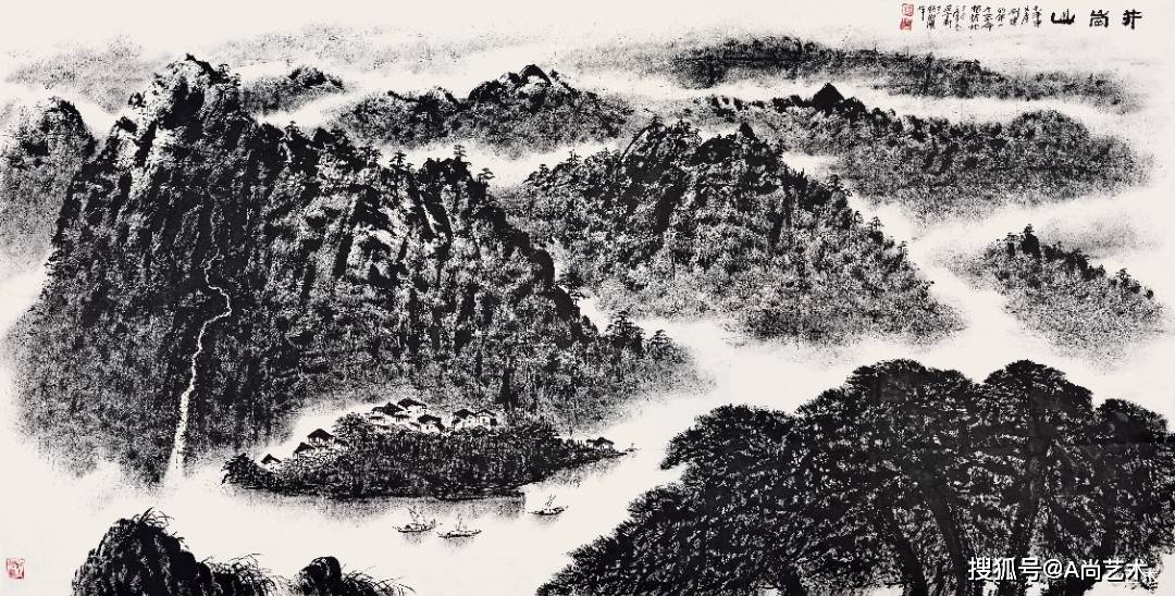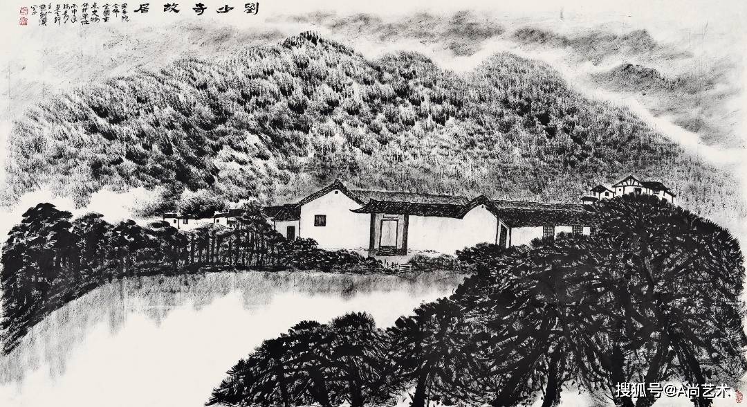 2. 焦墨以浓墨重笔铺陈山石、林木,通过浓淡干湿的墨色变化,既表现山石的厚重质感(如深墨皴擦的山体),又以淡墨晕染营造空灵感(如远山的朦胧层次)。墨色的张力与虚实,既契合传统山水“墨分五色”的审美逻辑,又以“焦墨”的苍劲质感强化历史厚重感,让自然景观成为承载历史精神的载体。