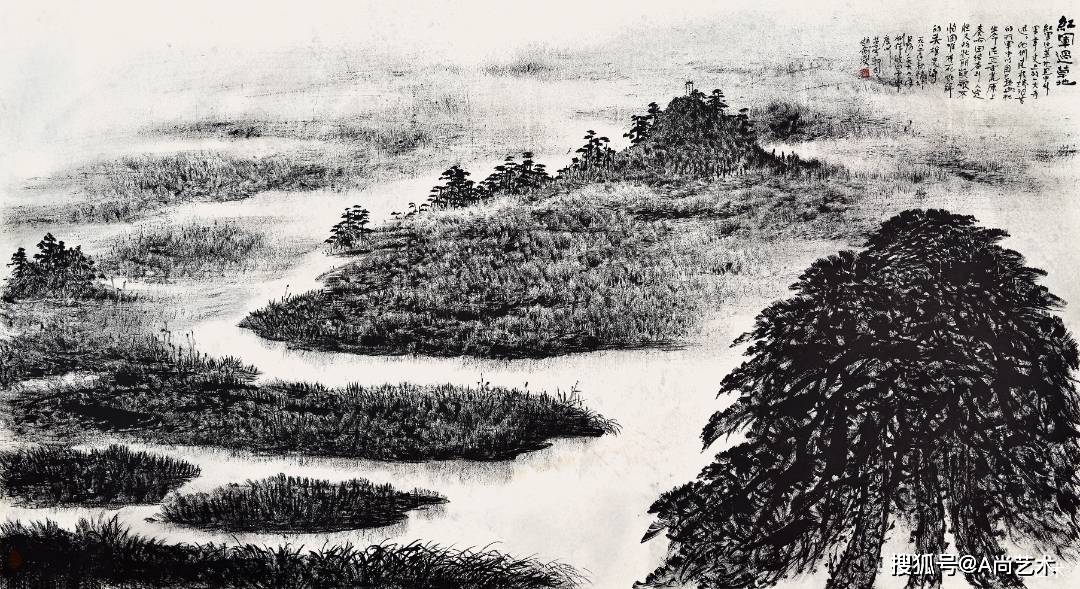- 水墨语言:采用黑白水墨技法,以浓淡干湿的墨色塑造画面层次。墨色在草地、树木、水域的处理中,既保留传统水墨的写意性,又通过墨块、线条的组合,精准还原草地的荒凉与自然环境的复杂性,展现出笔墨的灵动与力量感。