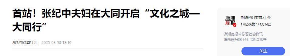 资料参考:2025-08-13湘湘带你看社会——首站!张纪中夫妇在大同开启“文化之城-大同行”