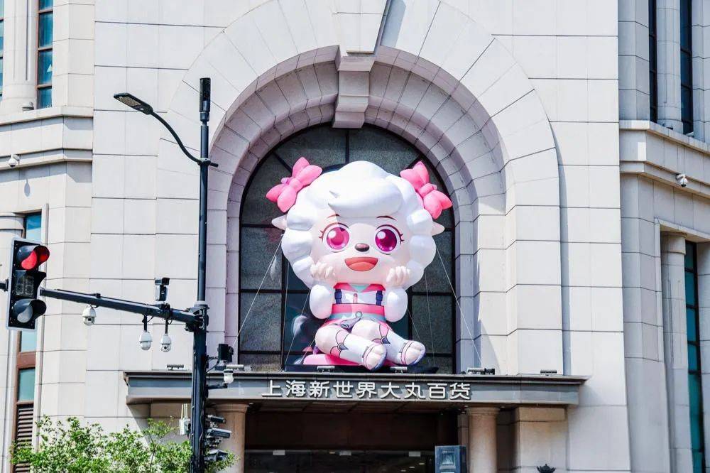 斜对角位于南京路步行街东拓街区的 新世界大丸百货也引进年轻业态 (《最终幻想14》官方授权的海德林主题咖啡餐厅),不定期举办二次元相关的展览活动,今年夏天门头6米高的巨型美羊羊气模更是被视为潮流地标,路过的游客无不为之停留打卡;