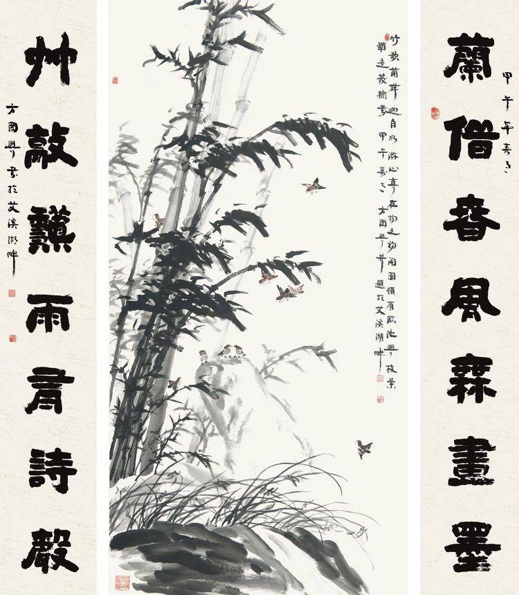 方國興(1946 年生)真正繼承中國文人畫傳統書畫同源的創作法則,對寫意精神進行了深層的領悟,對繪畫的文學性和美感來源悉心思索,結合音樂和舞蹈藝術的旋律和節奏,作畫善用書法筆意,用筆有方圓之變,講究筆情墨趣,將書法筆道引入意象造型,線條富有質感和深味,水墨交融化合,沉著老辣,酣暢淋漓,厚重而活脫,朴拙中見靈秀,從而使作品清新雋逸, 格調高雅,形神兼備,氣韻生動。