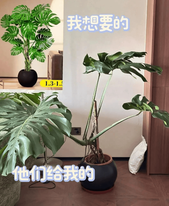摆在眼前的这盆龟背竹,和网图相比,简直是一个天上,一个地下。先看看根部,光秃秃的,毫无生机,一点美感都没有。再瞧瞧叶子,颜色暗淡,一点也不翠绿,而且还裂开得乱七八糟,完全没有网图中那种规整又高级的感觉。除了那个花盆勉强有点像,其他地方几乎找不到相似之处。这巨大的反差,难怪小伙子郁闷得不行,感觉自己的钱打了水漂。