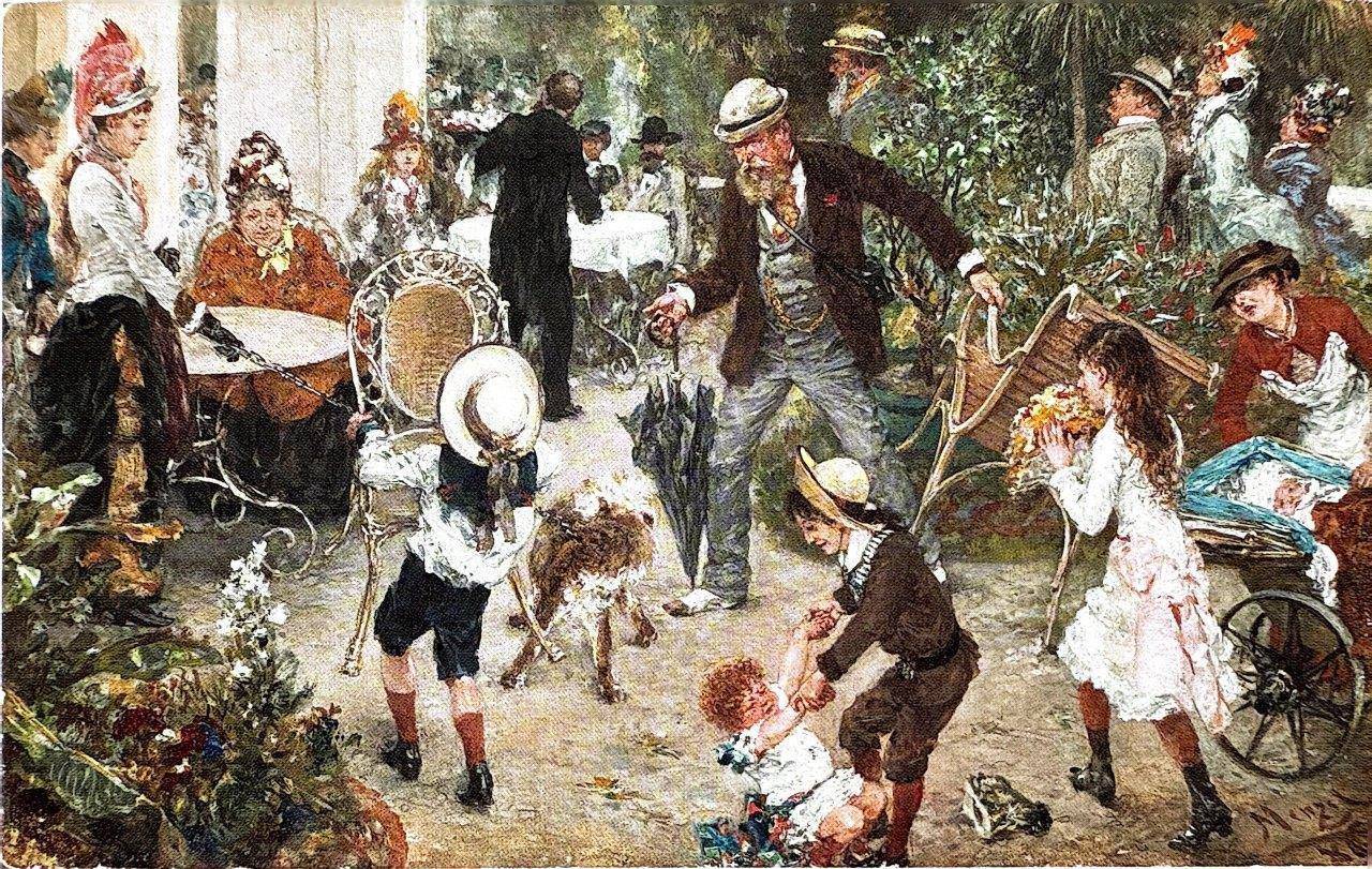 门采尔的水粉画《基辛根的咖啡时间》呈现的是一个欢乐的下午时光,画面源于法国一个温泉小镇的风光掠影。看,那些跑跳着、嬉闹着的孩子们。