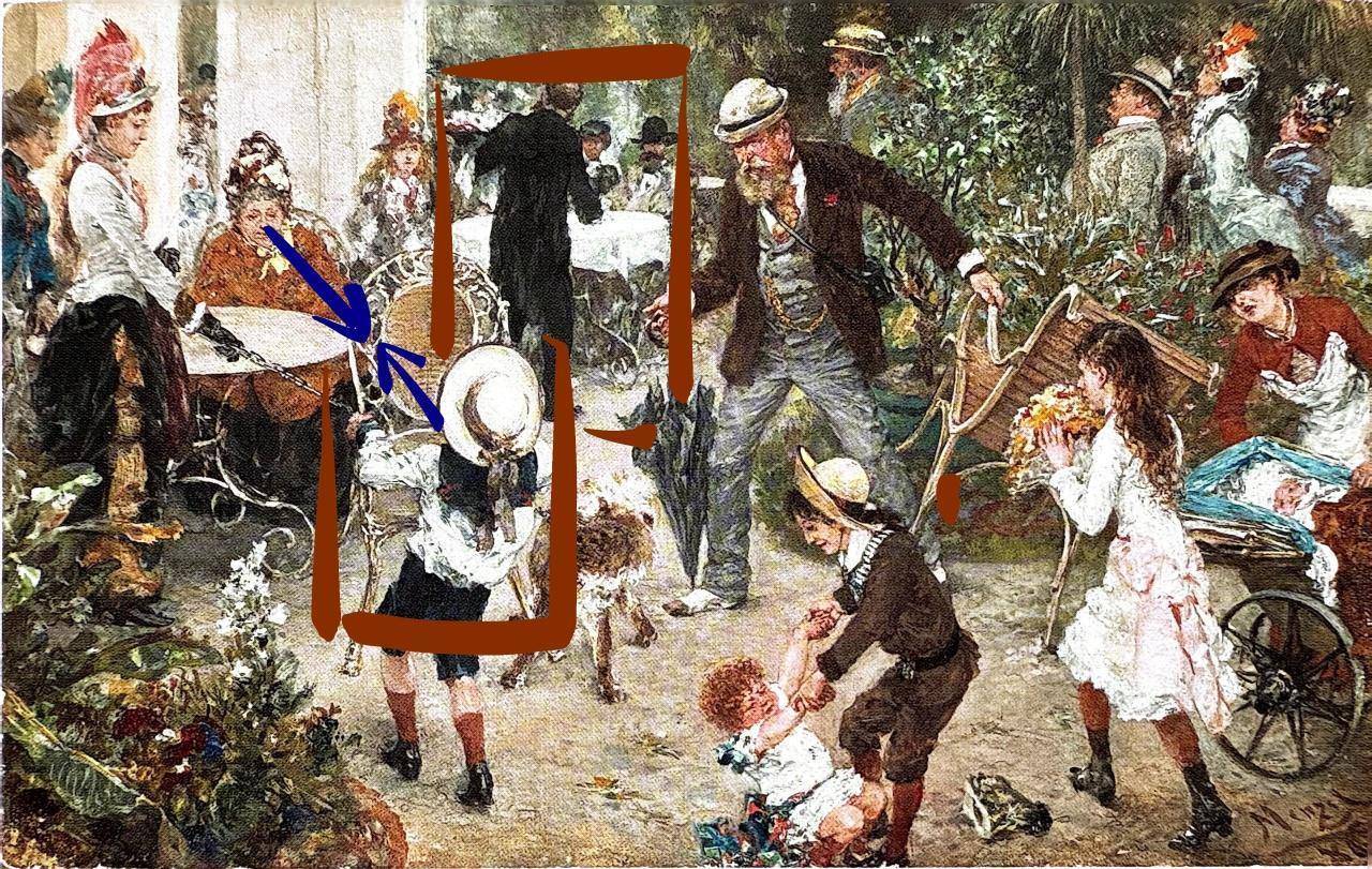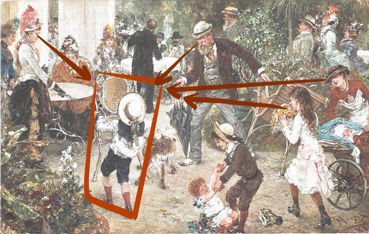 门采尔的这幅水粉作品,通过人物的不同朝向,在画面中形成了视线与身形的牵拉,使得这幅画面充满了动感与趣味性。现实生活中成年人与身边孩子们的嬉闹场景,