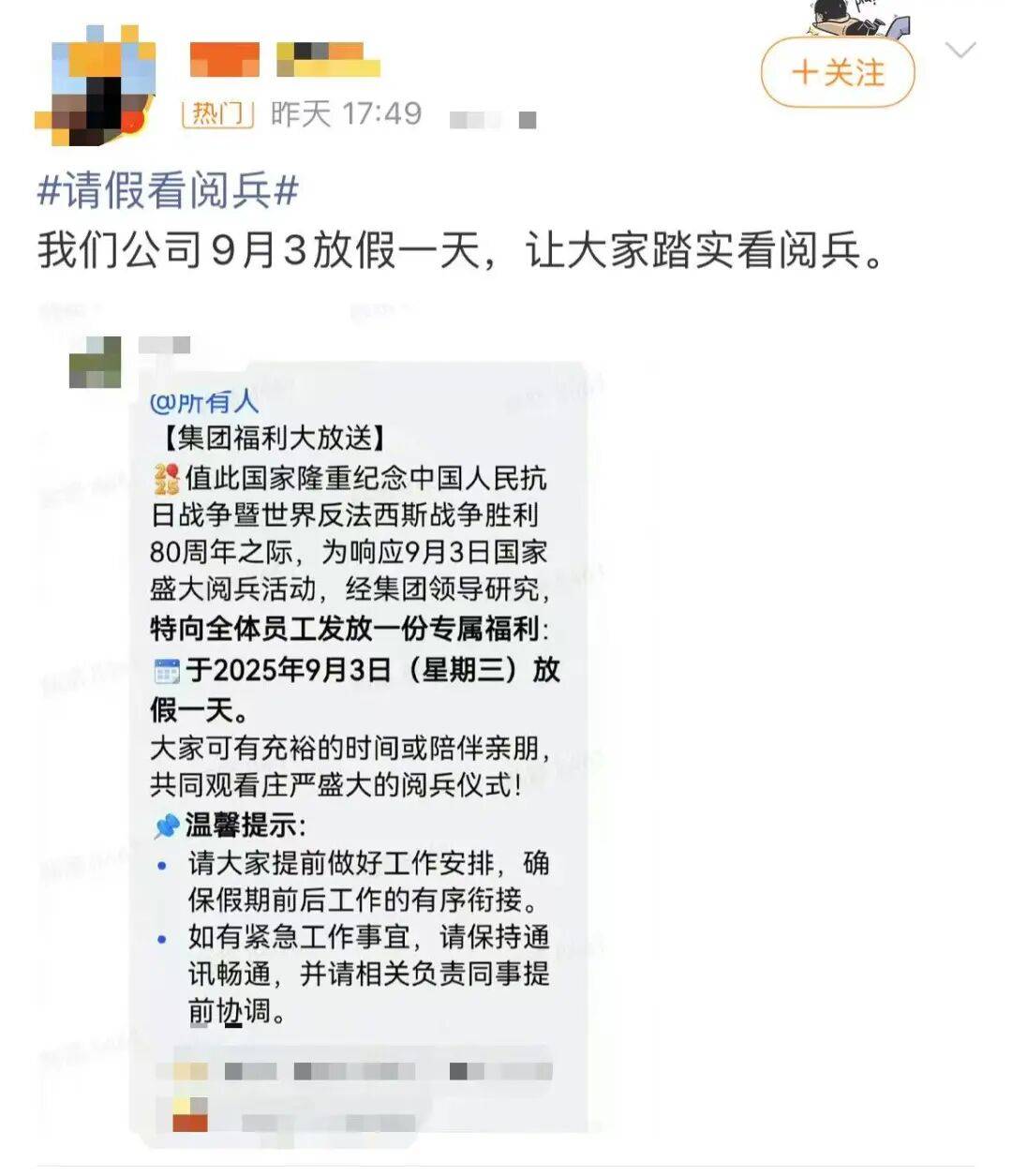 3、广东彩立德科技公司也表示,公司决定9月3日放假一天,在公司组织大家观看阅兵同时,公司还准备了烤全羊等佳肴(不扣工资算正常上班,但必须全员出勤)。