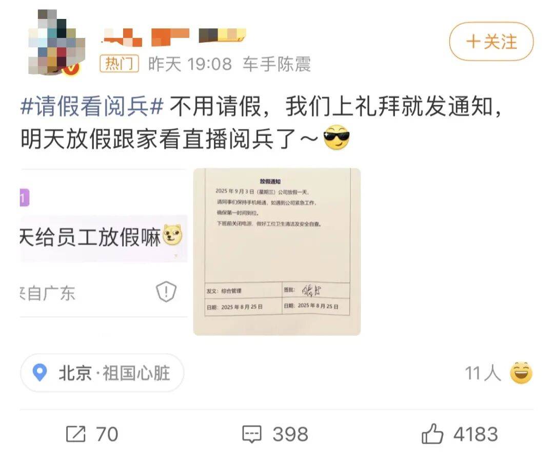 1、9月2日,有网友发视频称,东莞市一家公司发布通知,该公司决定2025年9月3日上午停止所有工作,所有人在培训室(大屏幕)观看阅兵直播。通知引发很多网友点赞。