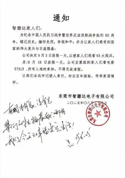 2、8月25日,东莞市智灏达电子有限公司发布通知称,为纪念中国人民抗日战争暨世界反法西斯战争胜利80周年,铭记历史,缅怀先烈,珍惜和平,亦为让家人们感受到国家的伟大复兴与日益强盛,公司决定9月3日放假一天,以便大家观看九三大阅兵。