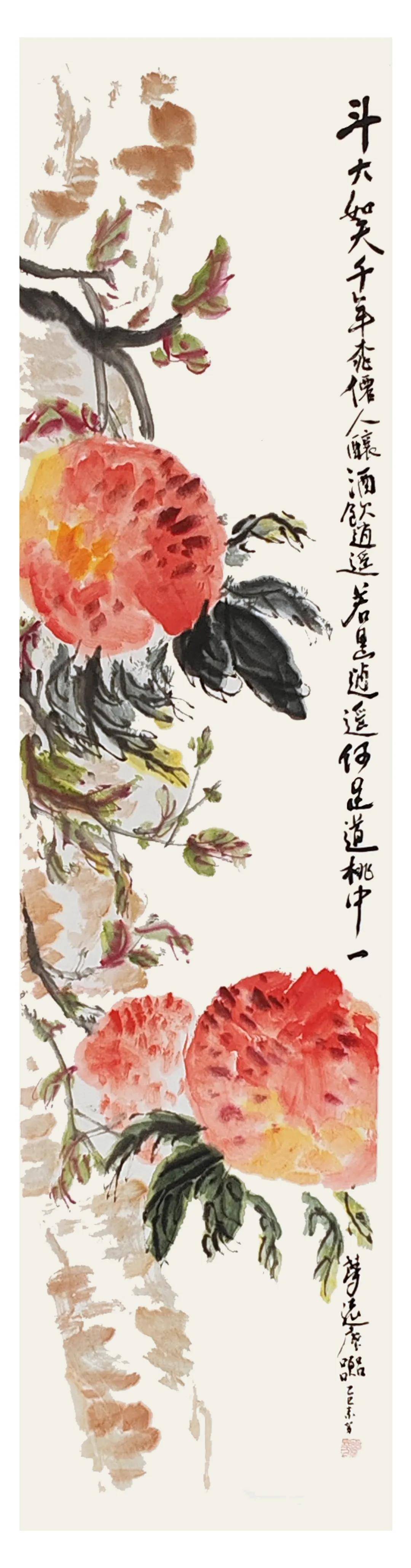题字“斗大如天千年桃”等增添了诗意,寓意仙桃象征长寿与吉祥。这不仅是一幅视觉上的盛宴,更是精神上的启迪,体现了对自然和生命的敬畏与热爱。