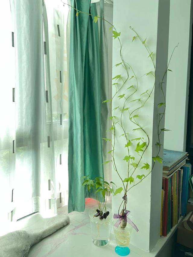 出了四个枝条,挨个比着长… 也不知道水培可以养多久, 把它固定在墙上像藤蔓一样, 看着它每天爬呀爬,真的好治愈呀!