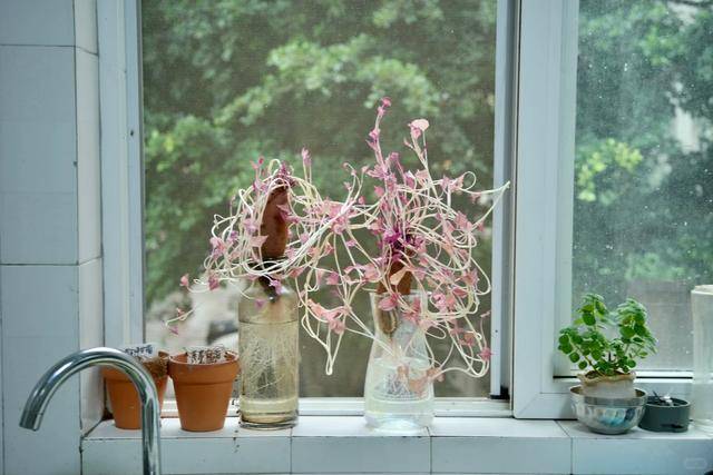 只愿用一次性筷子将它固定住放在花瓶口,注意不要浸泡到水里哦,会烂的,放在水面上一点就行,它会长出气生根,然后生根发芽,长满整个花瓶,要是嫌多也可以摘下来炒一盘~