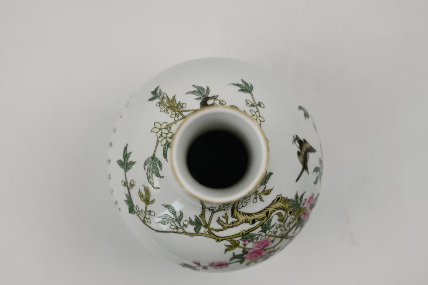 花鸟图案:瓶身常以花鸟为主题,如牡丹、桃花、兰花等花卉,姿态万千,每片花瓣色泽过渡自然;鸟儿或栖息枝头,或展翅欲飞,羽毛刻画细致入微,眼神、喙部等细节生动,花鸟相互映衬,构成生机盎然的诗意画卷,传达出富贵吉祥、繁荣昌盛的美好寓意。