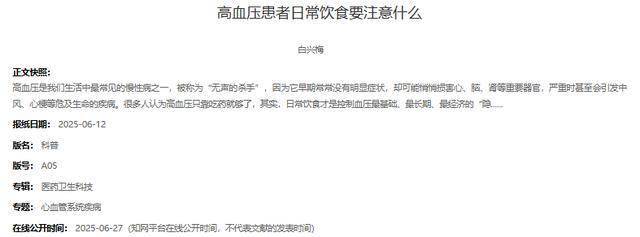 [1]白兴梅.高血压患者日常饮食要注意什么[N].山西科技报,2025.