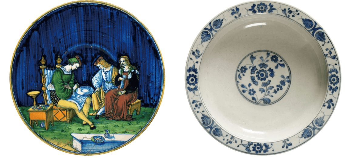 马约里卡陶盘(左),约1510—1520;美第奇瓷器(右),约1575—1587。《看,国宝:吴地文物再想象》插图