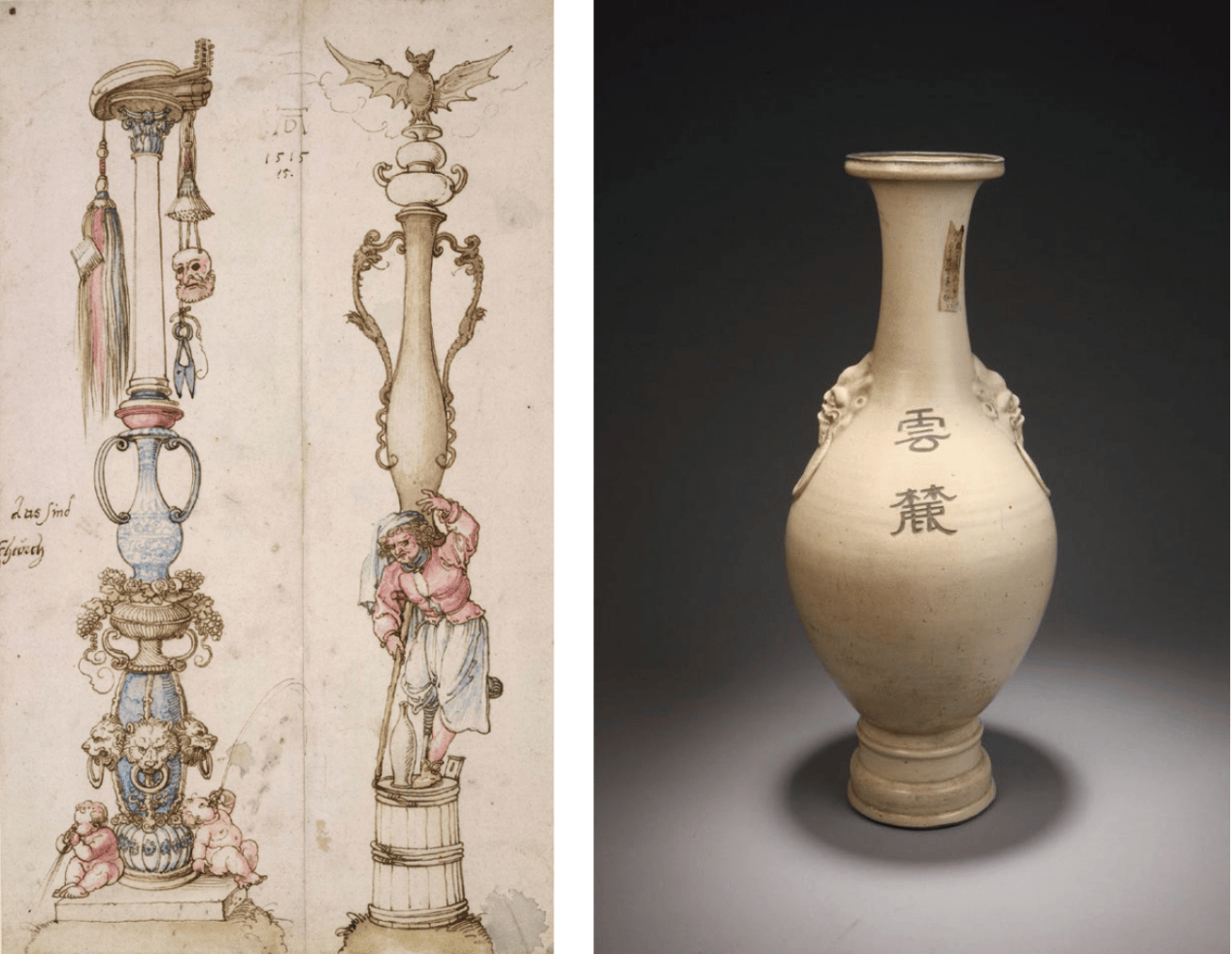 好奇心旺盛的艺术家们在文艺复兴时期应该还买不起这种当国礼赠送的东方奢侈品,但只要他们在宫廷里见到过,总会想办法画到自己的作品中,或用手稿记录下这种奇妙的相遇。德国艺术家丢勒就在一张设计手稿中留下了几件瓷器,左边两件青花瓷显而易见,右边那个应该是被拉长的定窑白釉铺首耳瓶。但仔细观察就会发现丢勒对三件瓷瓶都进行了挪用和改造:两个瓷瓶被加上了古希腊陶罐常见的把手,最精妙的还是把定窑瓷瓶左右两边的铺首放到了最下方的青花瓷上,不但改成了三个,还把从饕餮进化而来的铺首改成了狮子叼环。