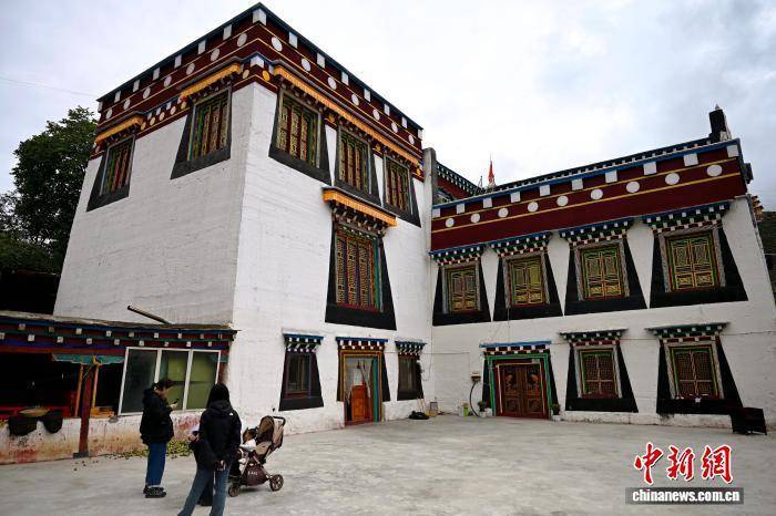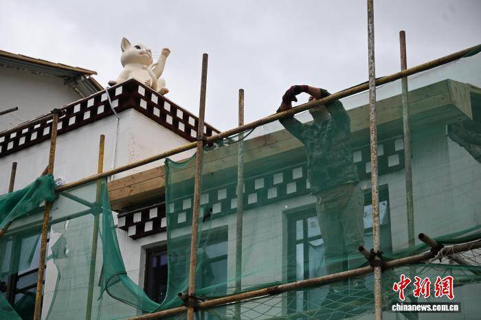 9月12日,四川省甘孜州乡城县青德镇传统村落白藏房初秋如画,一栋栋白色藏式民居错落有致地分布在山间,与农田相映生辉。白藏房属于土木结构,整体为梯形,房屋采用当地特有的阿戈土夯筑而成,外墙通过“白色灌礼节 ”定期浇灌白泥浆维护。当地白藏房构成全国最大夯土建筑群,乡城被称为“中国白藏房文化之乡”。图为工人在修缮房屋。中新社记者 张浪 摄