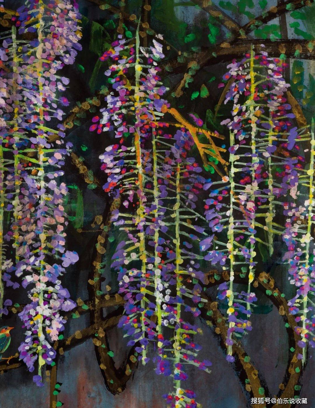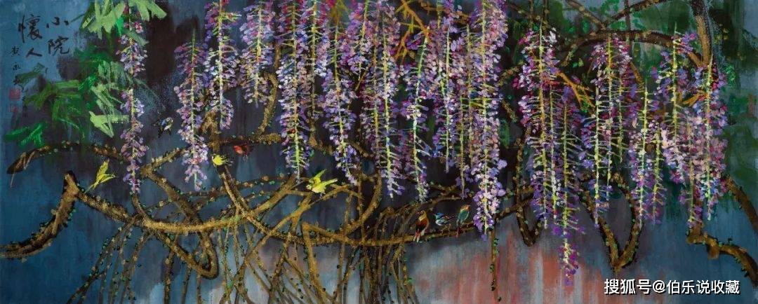 黄永玉先生作画喜欢用底色来铺垫所要表现的调子,不同的底色表现不同的意境。而此幅作品画家要表现夏日幽静的院落所以底色铺以青色,意境深邃,幽静,画面占主体的是挂满枝头的紫藤花,让观者顿生凉意、花香扑鼻。