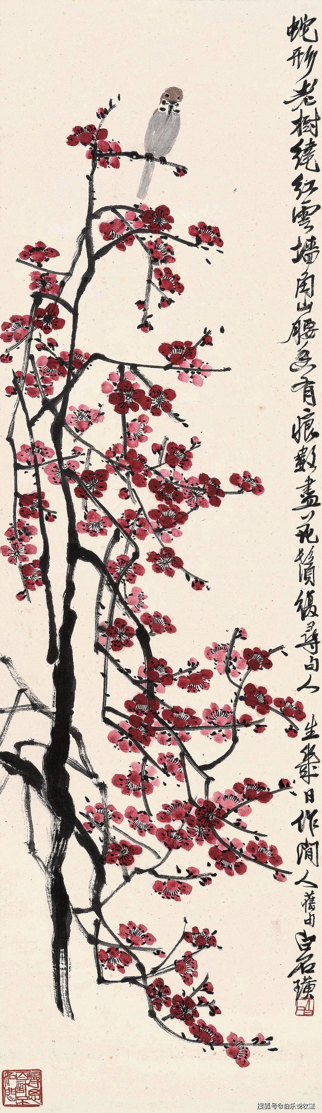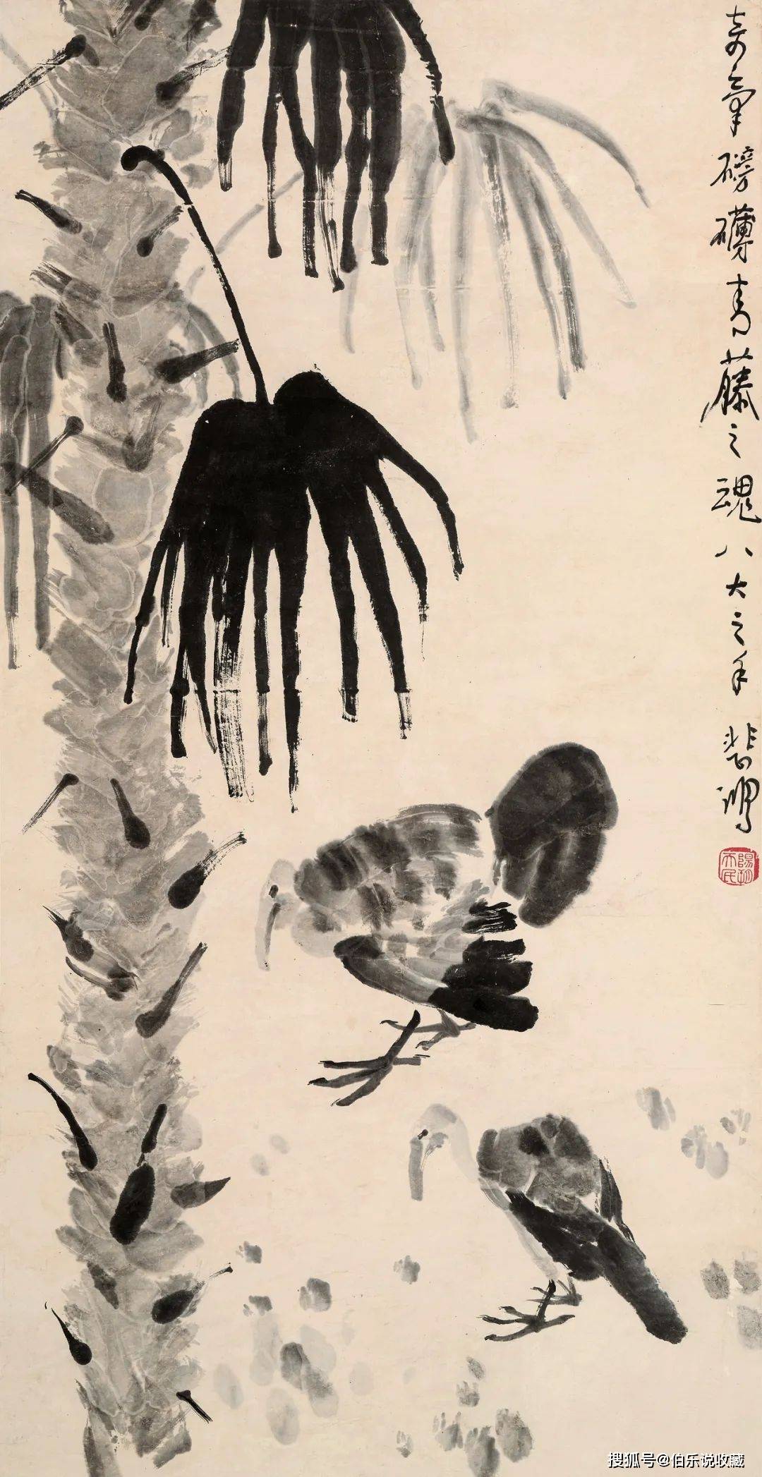 画面的下方是如龙蛇般行走、穿插的籘茎及两只飞行花间的小鸟,用金粉来表现,既突出、跳跃又富装饰性。无独有偶,齐白石也有一幅画题作“梨花小院怀人”,画上有一枝梨花,下有两只青蛙。客居北京的齐白石怀念的是湖南老家的风物,怀念的是在星斗塘的原配发妻。而黄永玉先生画的此幅作品我想也有其所怀之人、所怀之事,说不定就有一番感人的故事待我们去发掘。