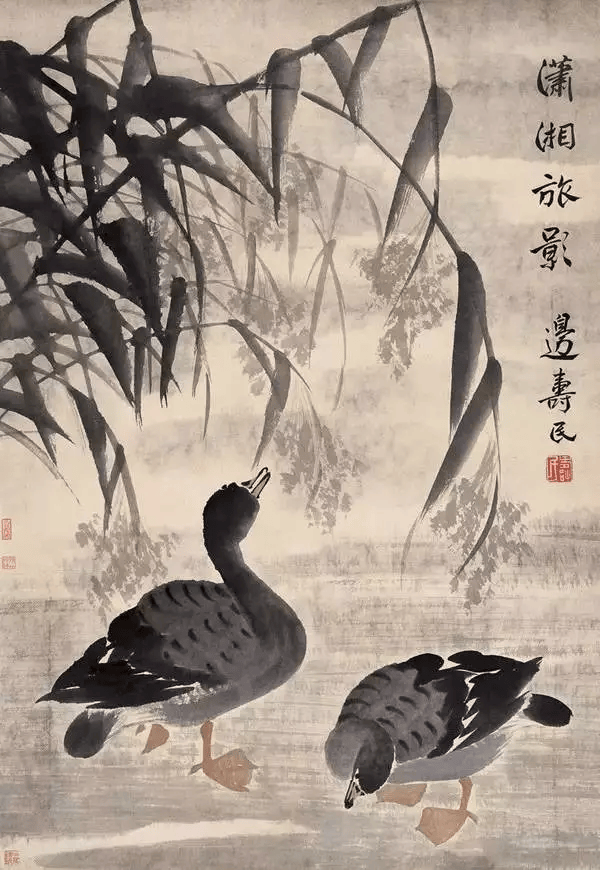象征手法是“幽妙以为理,想象以为事’’(清.叶燮《原诗》),也就是画家体会造化自然的微妙的生机动态,用生动、传神、具体可感的形象表现出来。这样创造出来的境界是深静的、是哲理的,也是偏于清醒的,画家创作的这种鸟的形象,往往寄寓着画家对社会生活哲理的思考和清醒、深厚的感情。画中的鸟,不再是一种写真的、简单的鸟,而是具有深厚、丰富思想内涵和感情内涵的鸟了。正如宗白华先生所说:“一天的春色寄托在数点桃花、二三水鸟,启示着自然的无限生机。’’
