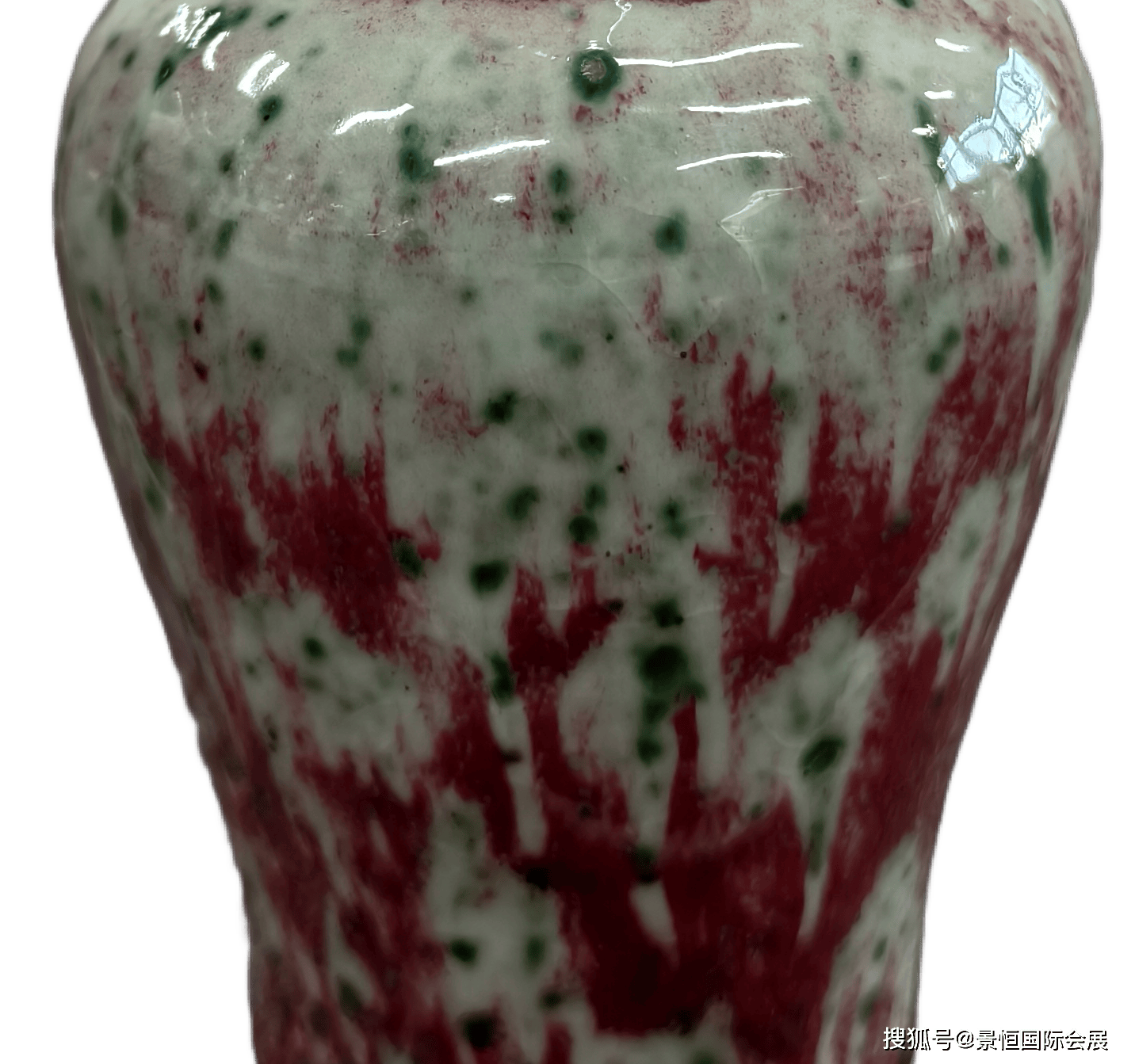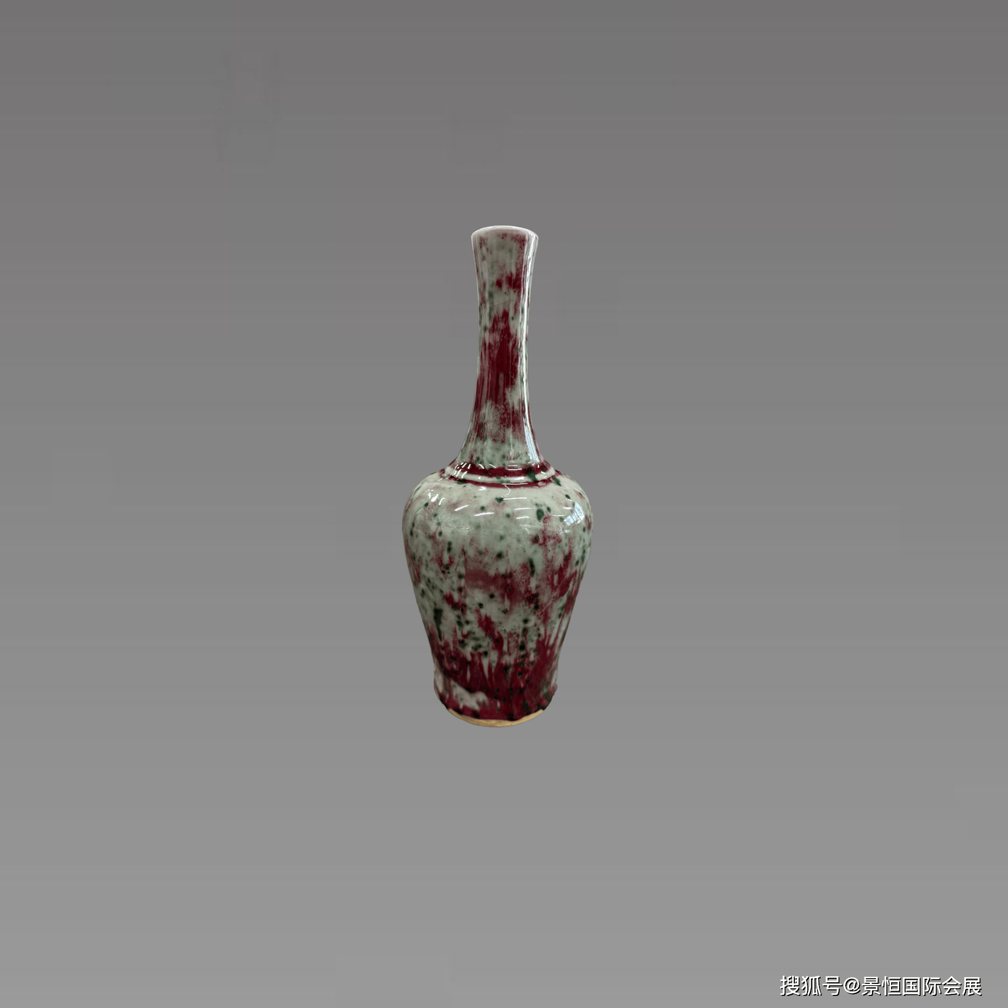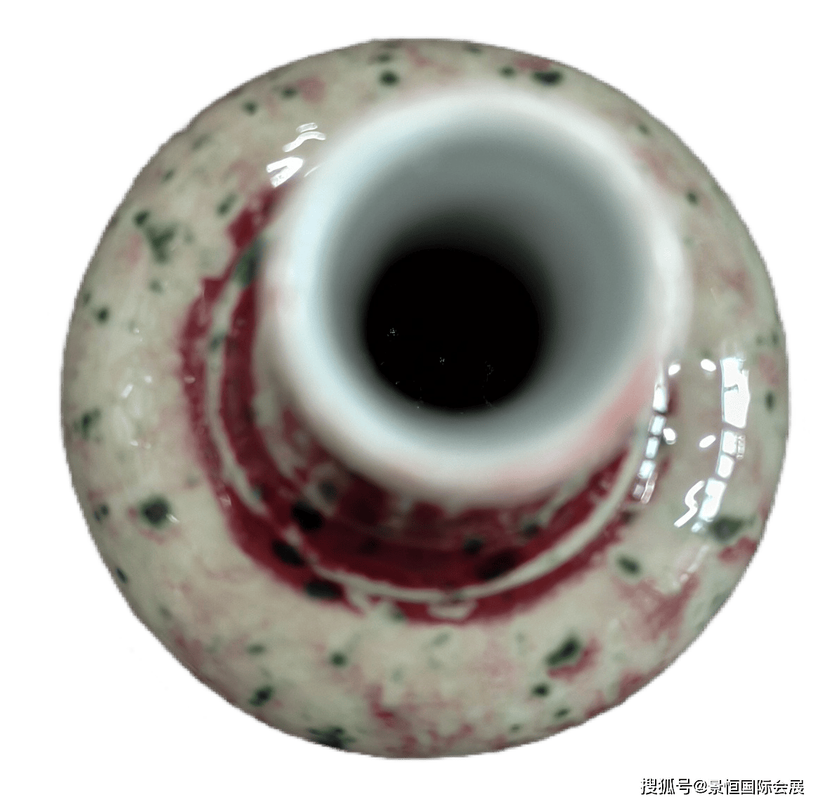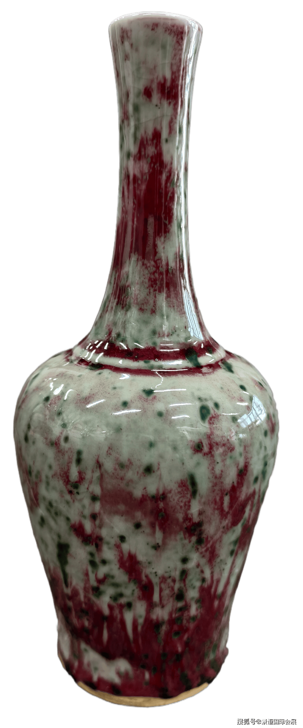 此藏品器底有“大庆康熙年制”六字三行楷书款。瓶口较小且规整,与细长的瓶颈相呼应,瓶颈细长,向上逐渐收窄,线条流畅优雅,从肩部延伸而出,瓶身部分较为丰满,呈上窄下宽的形态。因窑变效果,主要呈现出红白相间的色调,烧制过程中自然融合、晕染,产生了如云雾缭绕、山峦起伏般的纹理,充满了自然的随机性和艺术感。此外,还夹杂着一些绿色的斑点,这些斑点星星点点地分布在瓶身,为整体釉色增添了更多的变化和趣味,丰富了釉色的层次感。这件窑变釉摇铃尊瓶的独特釉色和自然形成的纹理,体现了自然天成的艺术美感。其造型优美,线条流畅,与窑变釉色相得益彰,将工艺之美与艺术之美完美融合,展现了中国传统瓷器工艺的精湛技艺和独特魅力。具有较高的收藏价值和文化艺术欣赏价值!