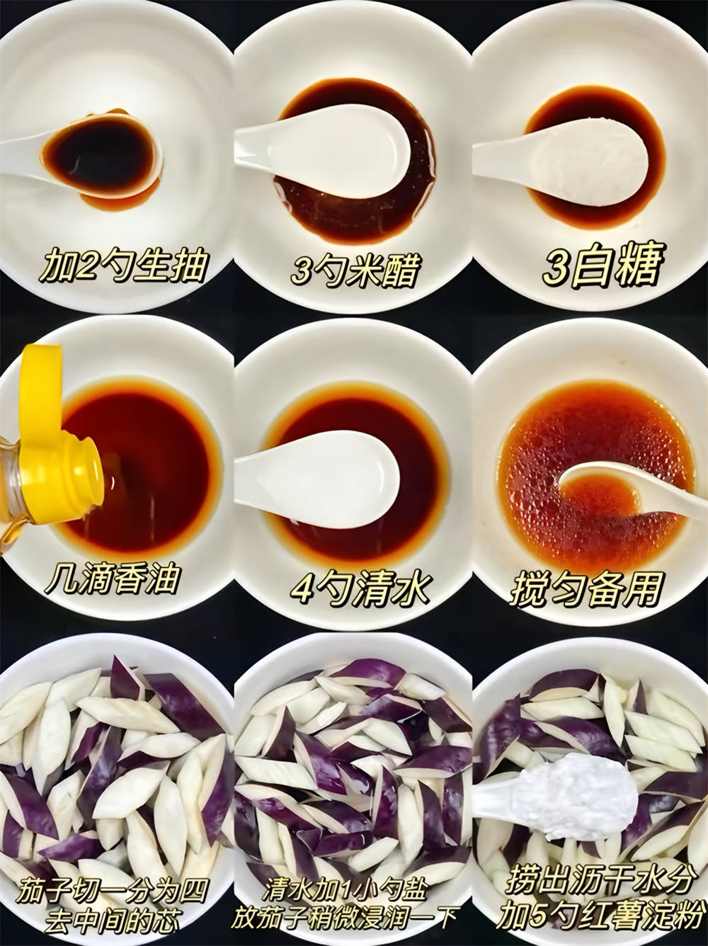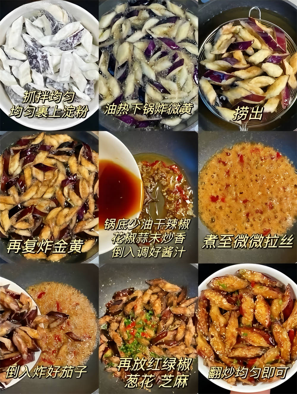 茄子、生抽20毫升左右、米醋30毫升、白糖30克、香油5毫升、清水40毫升、红薯淀粉50克、干辣椒剪成段10克、花椒抓一小把5克、蒜剁成末15克、红绿椒各半个切成小块、葱切成葱花10克、白芝麻5克、食用油
