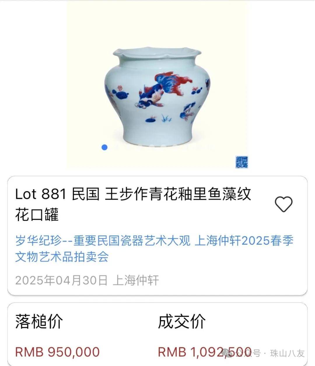 嘉德拍卖行的王步作品上拍量为 7 件,总成交额 33.38 万元 。相较于中贸圣佳和保利,嘉德的成绩或许略显逊色,但这也从侧面反映出不同拍卖行的品类侧重与市场定位差异。每个拍卖行都有其独特的优势和特色,在艺术品拍卖市场中相互补充,共同推动着王步瓷器作品的流通与传承。 这些拍卖行的成交数据,不仅是王步瓷器市场价值的直观体现,更是艺术品市场发展的生动记录,为我们深入了解王步瓷器的市场行情提供了宝贵的参考。