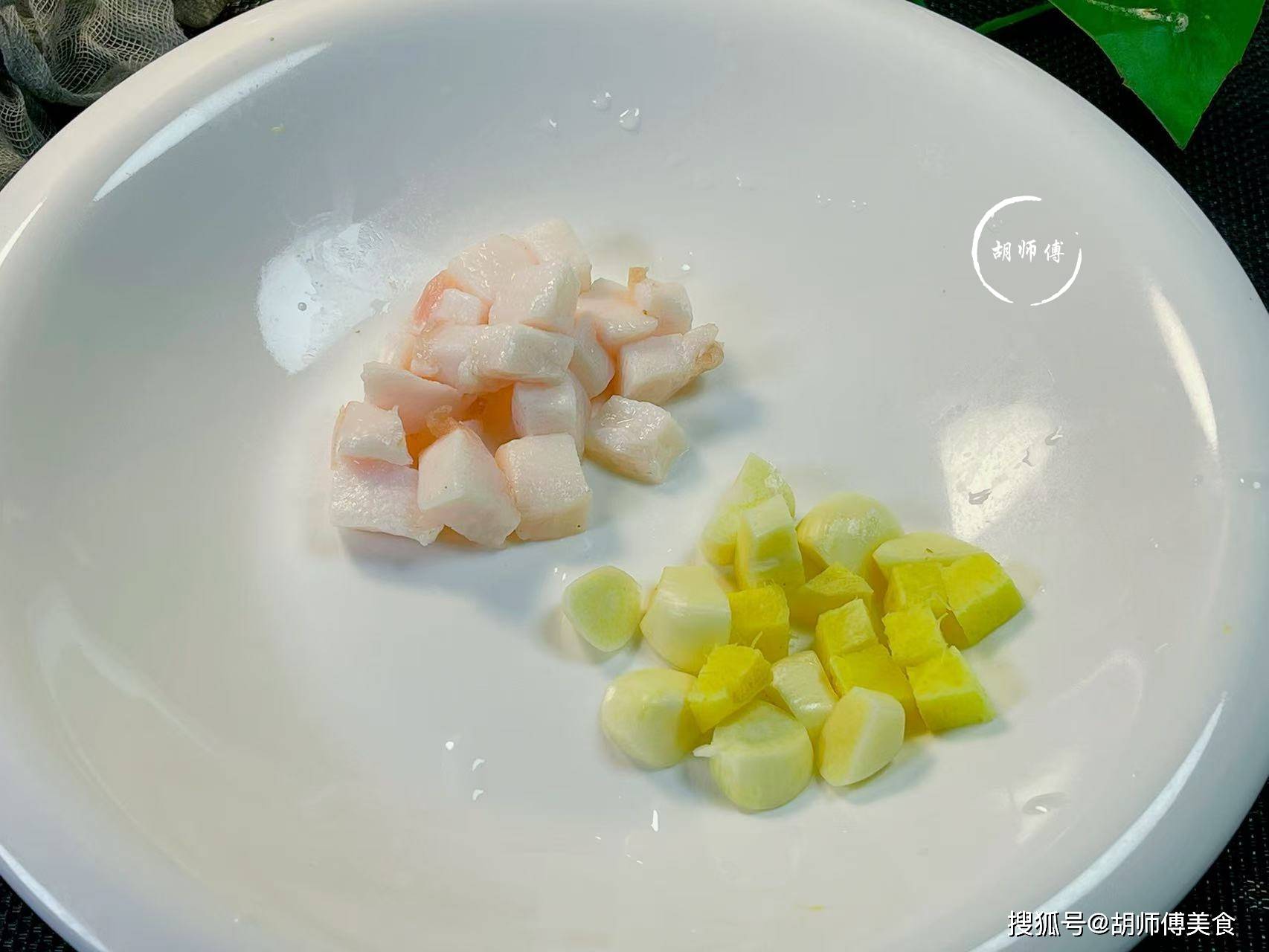第二步:将肥肉、蒜籽、老姜全部都冲洗干净后,再把它们切成1厘米左右的正方形备用。