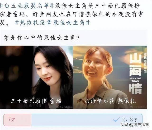 2021年热依扎惜败童谣的《三十而已》,没能拿到白玉兰奖。