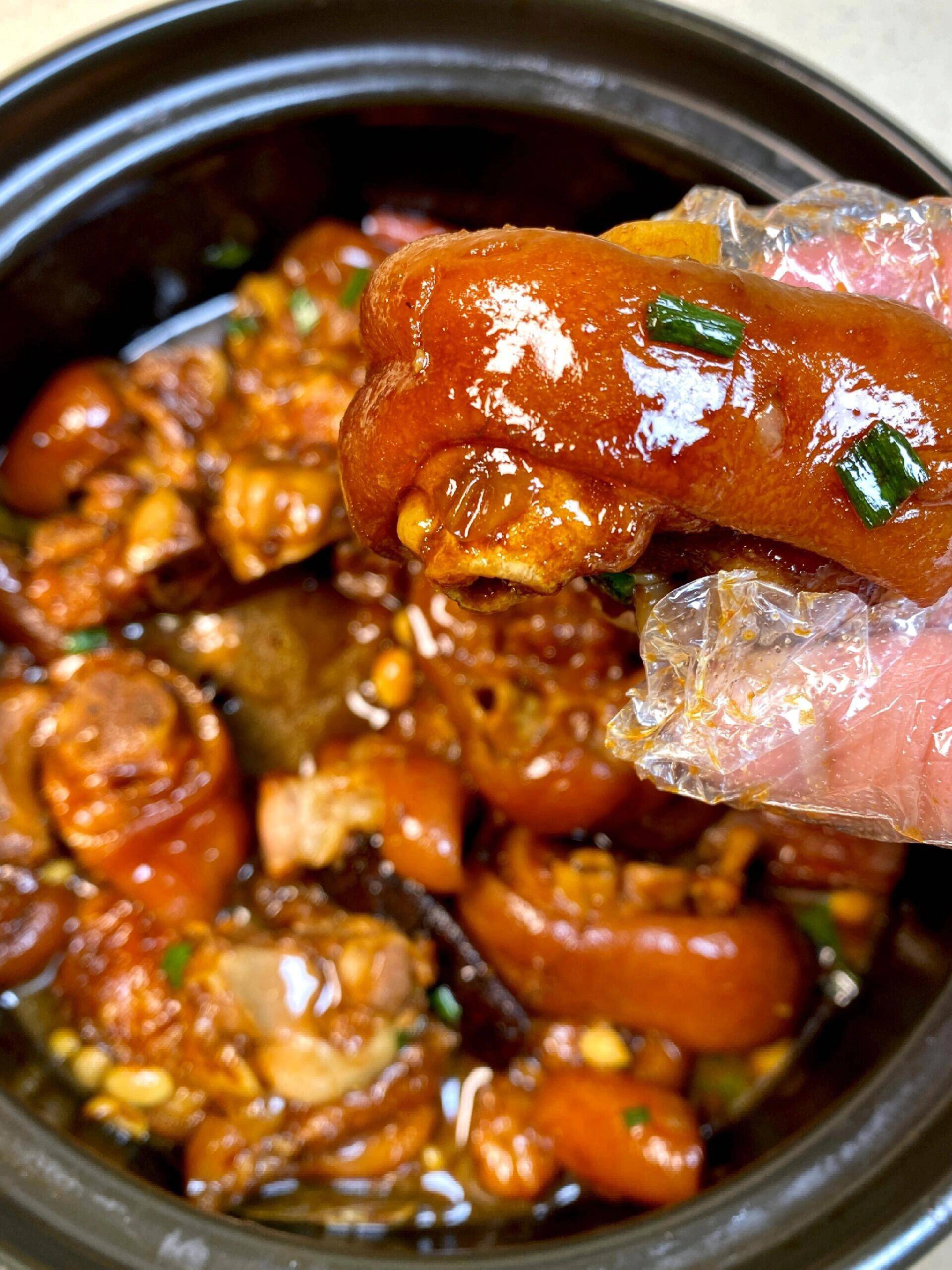 3. 砂锅慢炖魔法砂锅底铺姜片,放入炒好的猪蹄。加八角、香叶、干辣椒,倒入3勺生抽、1勺老抽,重点来了,先倒啤酒没过猪蹄,再补开水至完全淹没!啤酒能让肉质更软,开水能保持温度稳定。大火煮沸后转小火,盖盖子焖1小时。4. 黄豆加入群聊泡发的黄豆沥干,放入砂锅继续焖30分钟。用筷子戳猪蹄,能轻松穿透时开大火收汁(留1/3汤汁拌饭!)。撒葱花前偷偷尝口汤,不够咸再加盐调整。⚠️老爸的私房小技巧1. 选蹄黄金法则:前蹄短粗带筋,后蹄细长肉少,认准七短八圆的前蹄!2. 炒糖色急救包:万一炒苦了?立刻倒热水补救,或者加半勺番茄酱中和!3. 啤酒替代方案:没啤酒用1勺料酒+1勺米醋+清水代替,但风味会打折扣。4. 时间管理术:提前一晚泡黄豆、焯猪蹄,第二天1小时就能吃上!上周家庭聚餐,这锅猪蹄成了绝对主角。90岁的奶奶用汤汁泡了半碗饭,眯着眼说这味道,和我年轻时在国营饭店吃的差不多。正在减肥的表姐连啃三块,举着骨头感叹原来低卡餐之外还有这种幸福!