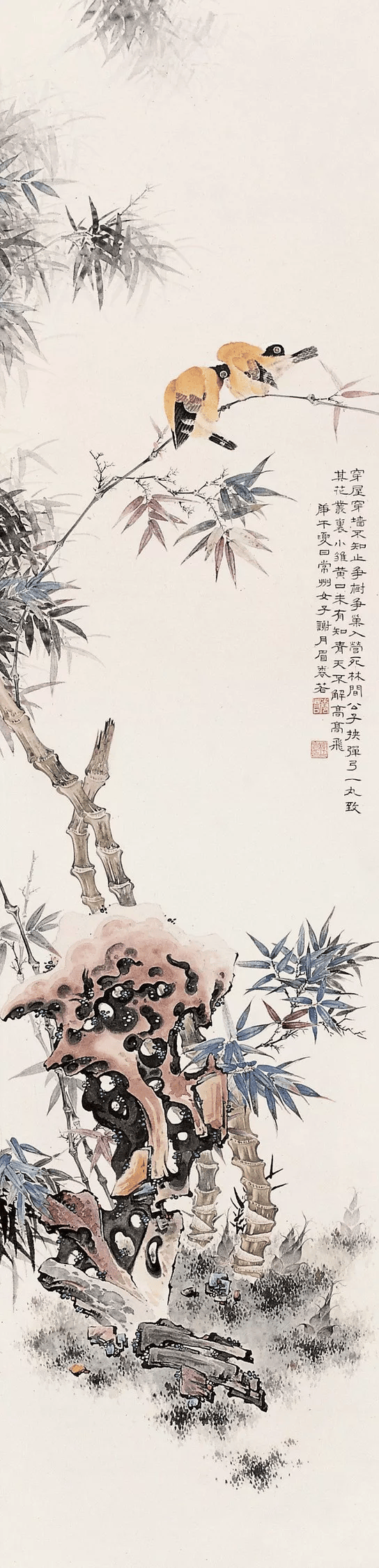 谢月眉早年的绚烂多才与晚年的静谧平淡,一如她纸绢上的工笔花鸟,只是在设色上略有些不同的深浅浓淡而已。